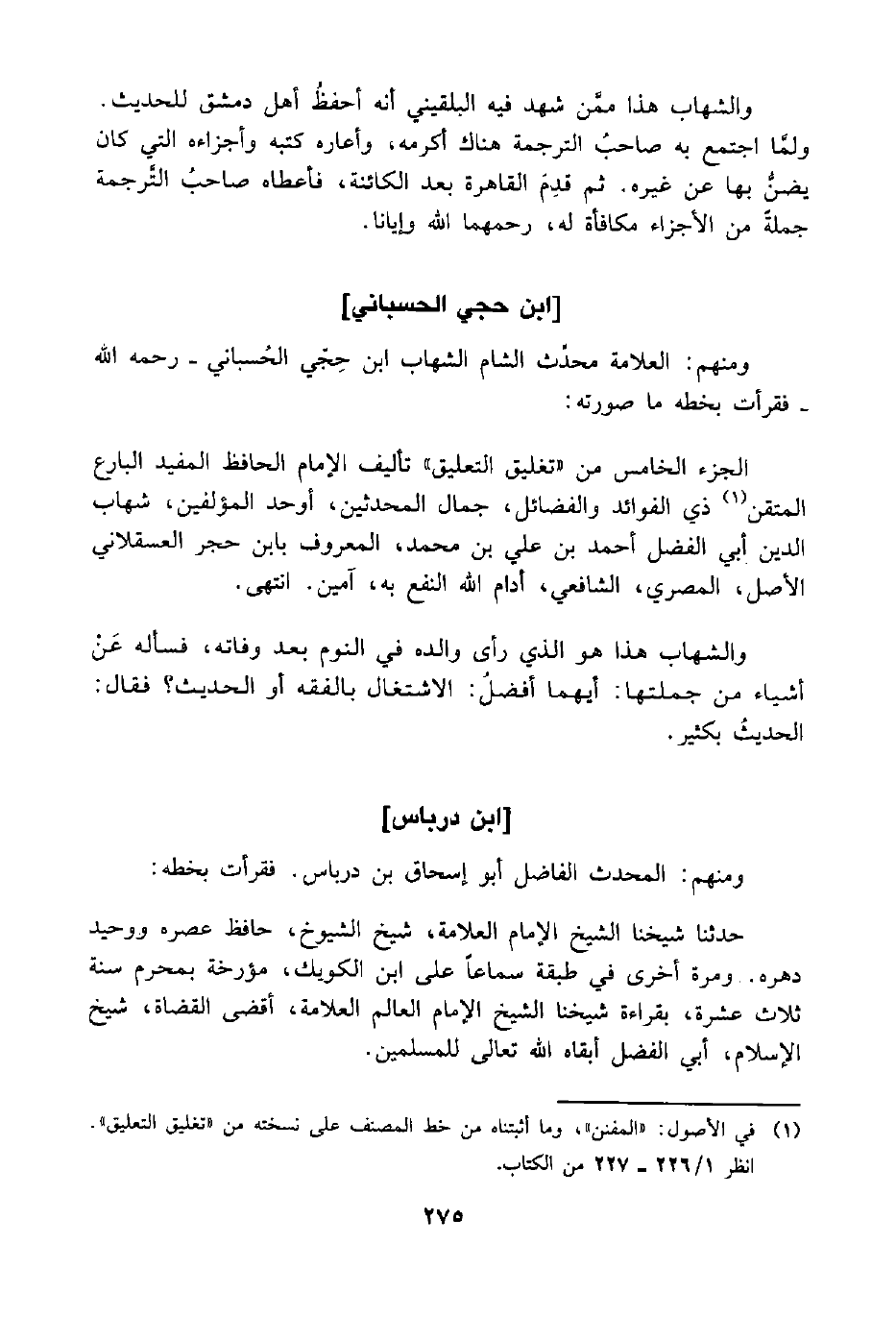 ومنهم: العلامة محدِّث الشام الشهاب ابن حِجّي الحُسباني -رحمه اللَّه- فقرأت بخطه ما صورته: