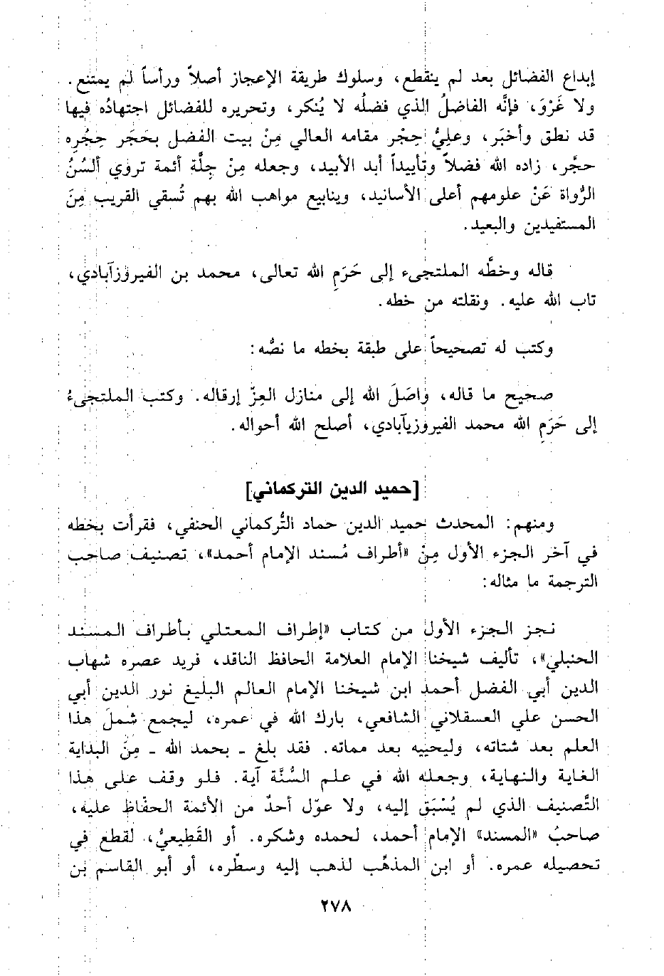 ومنهم: المحدث حميد الدين حماد التُّركماني الحنفي، فقرأت بخطه في آخر الجزء الأول مِنْ "أطراف مُسند الإمام أحمد"، تصنيف صاحب الترجمة ما مثاله:
