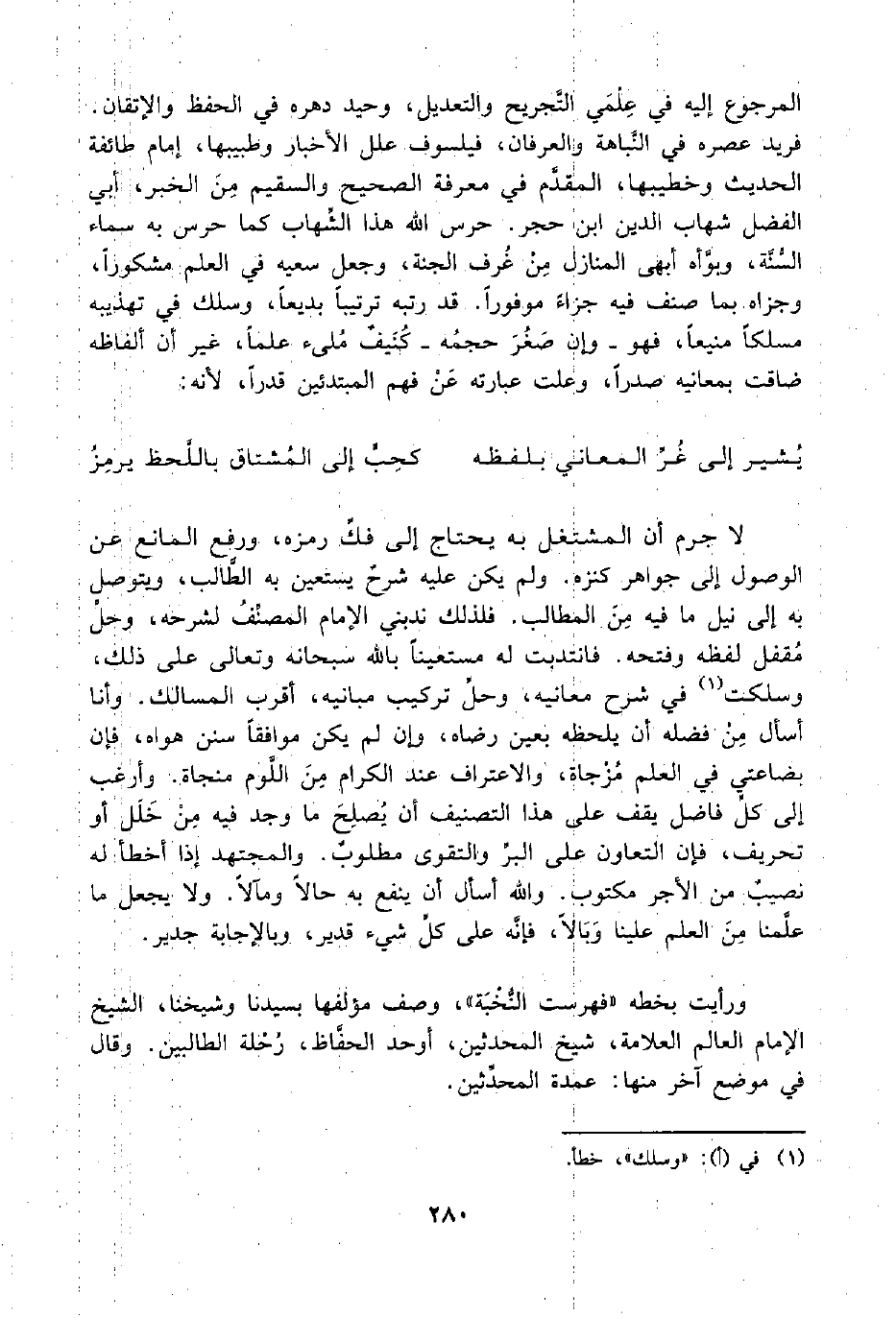 المرجوع إليه في عِلْمَي التَّجريح والتعديل، وحيد دهره في الحفظ والإتقان. فريد عصره في النَّباهة والعرفان، فيلسوف علل الأخبار وطبيبها، إمام طائفة الحديث وخطيبها، المقدَّم في معرفة الصحيح والسقيم مِنَ الخبر، أبي الفضل شهاب الدين ابن حجر. حرس اللَّه هذا الشِّهاب كما حرس به سماء السُّنَّة، وبوَّأه أبهى المنازل مِنْ غُرف الجنة، وجعل سعيه في العلم مشكورًا، وجزاه بما صنف فيه جزاءً موفورًا. قد رتبه ترتيبًا بديعًا، وسلك في تهذيبه مسلكًا منيعًا، فهو -وإن صَغُرَ حجمُه- كُنَيف مُلىء علمًا، غير أن ألفاظه ضاقت بمعانيه صدرًا، وعلت عبارته عَن فهم المبتدئين قدرًا، لأنه: