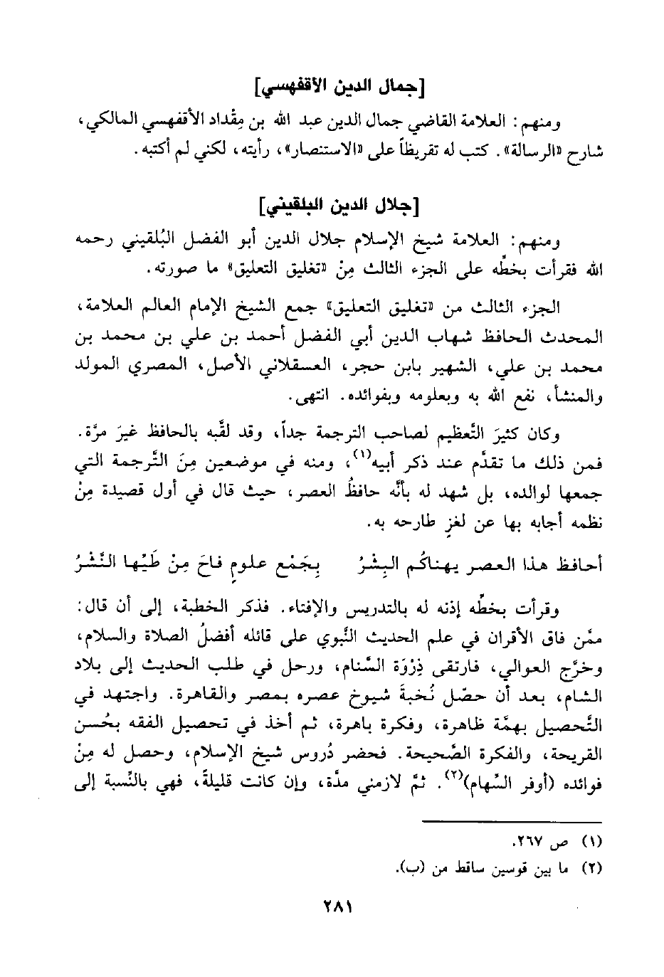 ومنهم: العلامة شيخ الإسلام جلال الدين أبو الففل البُلقيني رحمه اللَّه فقرأت بخطِّه على الجزء الثالث مِنْ "تغليق التعليق" ما صورته.