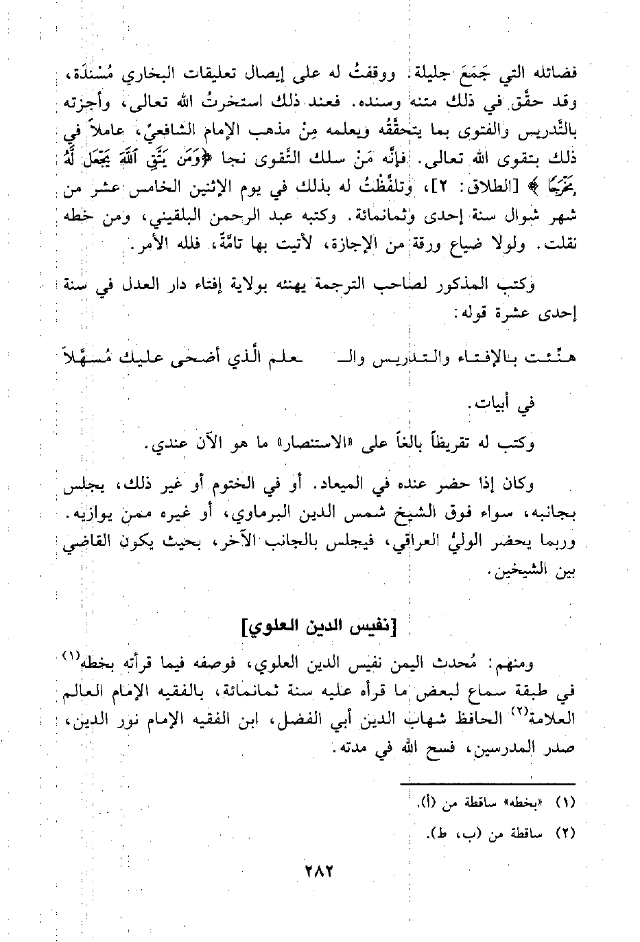 ومنهم: مُحدث اليمن نفيس الدين العلوي، فوصفه فيما قرأته بخطه (¬1) في طبقة سمح لبعض ما قرأه عليه سنة ثمانمائة، بالفقيه الإمام العالم العلامة (¬2) الحافظ شهاب الدين أبي الفضل، ابن الفقيه الإمام نور الدين، صدر المدرسين، فسح اللَّه في مدته.