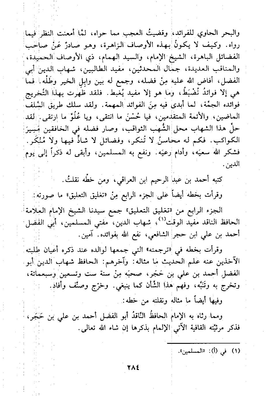 والبحر الحاوي للفرائد، وقضيتُ العجب مما حواه، لمَّا أمعنت النظر فيما رواه. وكيف لا يكونُ بهذه الأوصاف الزاهرة، وهو صادرٌ عَنْ صاحب الفضائل الباهرة، الشيخ الإمام، والسيد الهمام، ذي الأوصاف الحميدة، والمناقب العديدة، جمال المحدثين، مفيد الطالبين، شهاب الدين أبي الفضل، أفاض اللَّه عليه مِنْ فضله، وجمع له بين وابِلِ الخير وطَلِّه. فما هي إلا فوائدُ تُضْبَطُ، وما هو إلا مفيد يُغبط. فلقد ظهرت بهذا التَّخريج فوائده الجمَّة، لما أبدى فيه مِنَ الفوائد المهمة. ولقد سلك طريق السَّلف الماضين، والأئمة المتقدمين، فيا حُسْنَ ما انتقى، ويا عُلُوَّ ما ارتقى. لقد حلَّ هذا الشهاب محل الشُّهب الثواقب، وصار فضله في الخافقين مَسِيرَ الكواكب. فكم له محاسن لا تُنكر، وفضائل لا شاذَّ فيها ولا مُنْكَر. فشكر اللَّه سعيَه، وأدام رعيَه. ونفع به المسلمين، وأبقى له ذكرًا إلى يوم الدين.