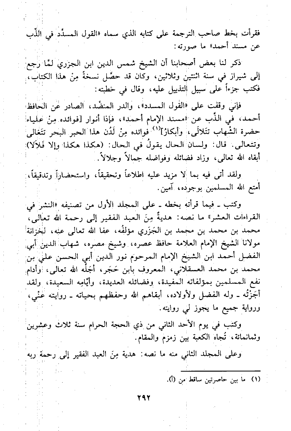 فقرأت بخط صاحب الترجمة على كتابه الذي سماه "القول المسدَّد في الذَّب عن مسند أحمد" ما صورته: