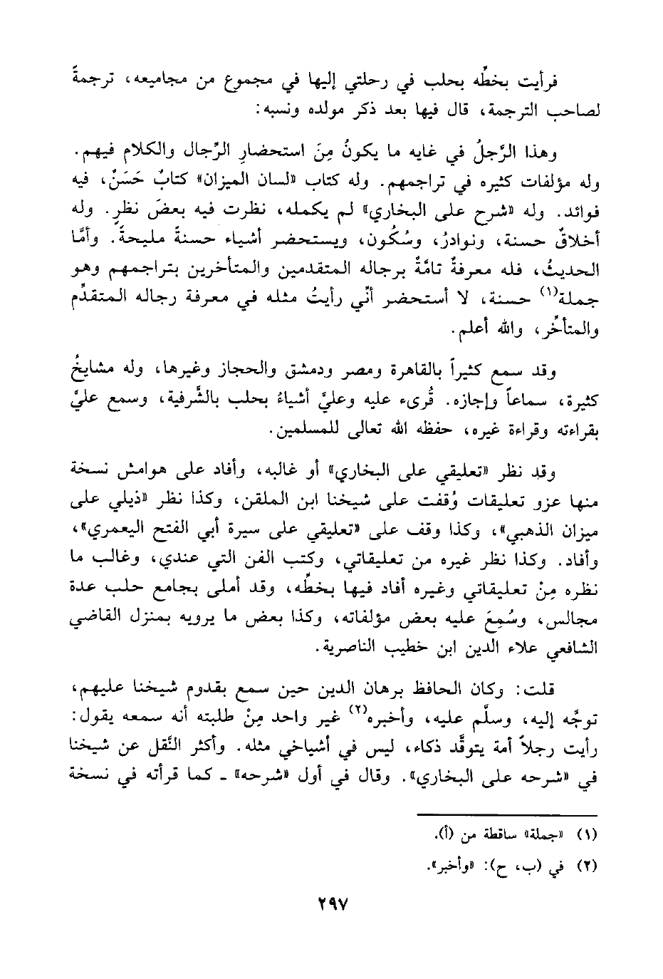 وهذا الرَّجلُ في غايه ما يكونُ مِنَ استحضارِ الرِّجال والكلام فيهم. وله مؤلفات كثيره في تراجمهم. وله كتاب "لسان الميزان" كتابٌ حَسَنٌ، فيه فوائد. وله "شرح على البخاري" لم يكمله، نظرت فيه بعضَ نظرٍ. وله أخلاقٌ حسنة، ونوادرُ، وسُكُون، ويستحضر أشياء حسنةً مليحةً. وأمَّا الحديثُ، فله معرفةٌ تامَّةٌ برجاله المتقدمين والمتأخرين بتراجمهم وهو جملة (¬1) حسنة، لا أستحضر أنِّي رأيتُ مثله في معرفة رجاله المتقدِّم والمتأخِّر، واللَّه أعلم.