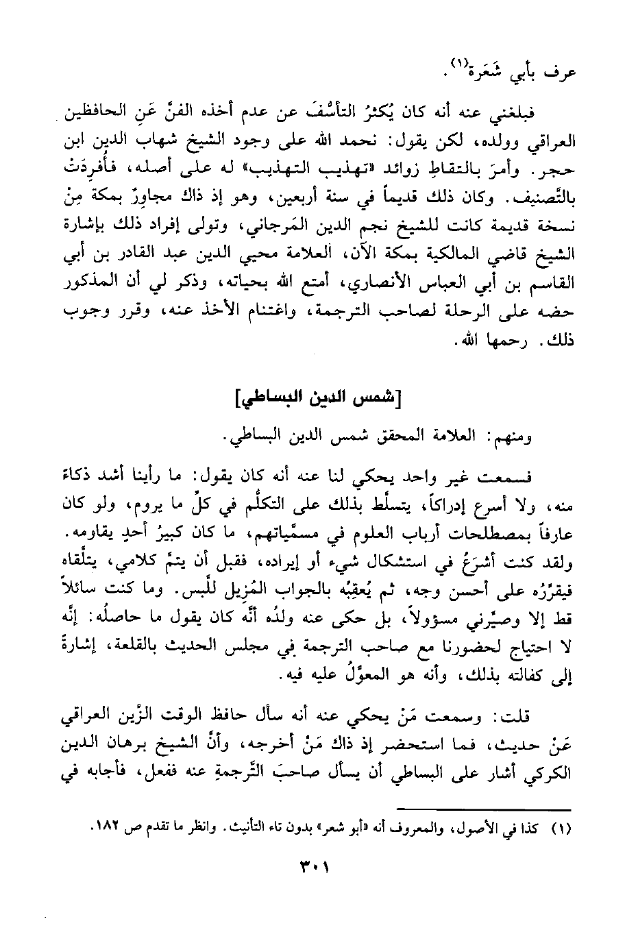 قلت: وسمعت مَنْ يحكي عنه أنه سأل حافظ الوقت الزَّين العراقي عَنْ حديث، فما استحضر إذ ذاك مَنْ أخرجه، وأنَّ الشيخ برهان الدين الكركي أشار على البساطي أن يسأل صاحبَ التَّرجمةِ عنه ففعل، فأجابه في