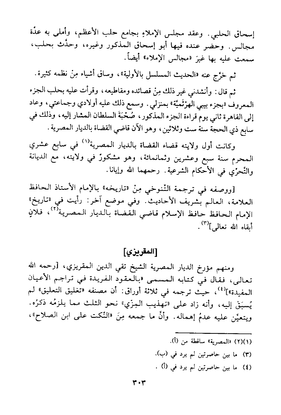 ومنهم مؤرخ الديار المصرية الشيخ تقي الدين المقريزي، [رحمه اللَّه تعالى، فقال في كتابه المسمى "بالعقود الفريدة في تراجم الأعيان المفيدة"] (¬4)، حيث ترجمه في ثلاثة أوراق: أن مصنفه "تغليق التعليق" لم يُسبَق إليه، وأنه زاد على "تهذيب المِزّي" نحو الثلث مما يلزمُه ذكرُه. ويتعيَّن عليه عدمُ إهماله. وأنَّ ما جمعه مِنَ "النُّكت على ابن الصلاح"،