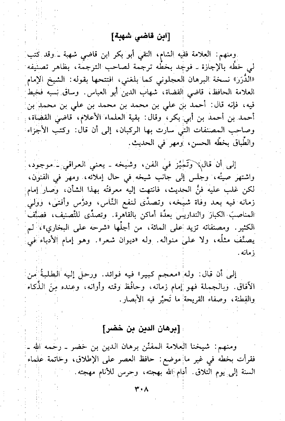 ومنهم: شيخنا العلامة المفنَّن برهان الدين بن خضر -رحمه اللَّه- فقرأت بخطه في غير ما موضع: حافظ العصر على الإطلاق، وخاتمة علماء السنة إلى يوم التلاق. أدام اللَّه بهجته، وحرس للأنام مهجته.