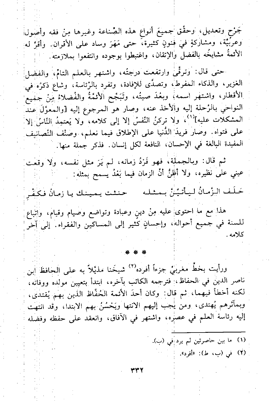 ورأيت بخطٍّ مغربيٍّ جزءًا أفرده (¬2) شيخَنا مذيَّلًا به على الحافظ ابن ناصر الدين في الحفاظ، فترجمه الكاتب بآخره، ابتدأ بتعيين مولده ووفاته، لكنه أخطأ فيهما، ثم قال: وكان أحدَ الأئمة الحُفَّاظ الذين بهم يُقتدى، وبمآثرهم يُهتدى، ومن يجب إليهم الانتها ويَحْسُنُ بهم الابتدا، وقد انتهت إليه رئاسة العلم في عصره، واشتهر في الآفاق، وانعقد على حفظه وفضله