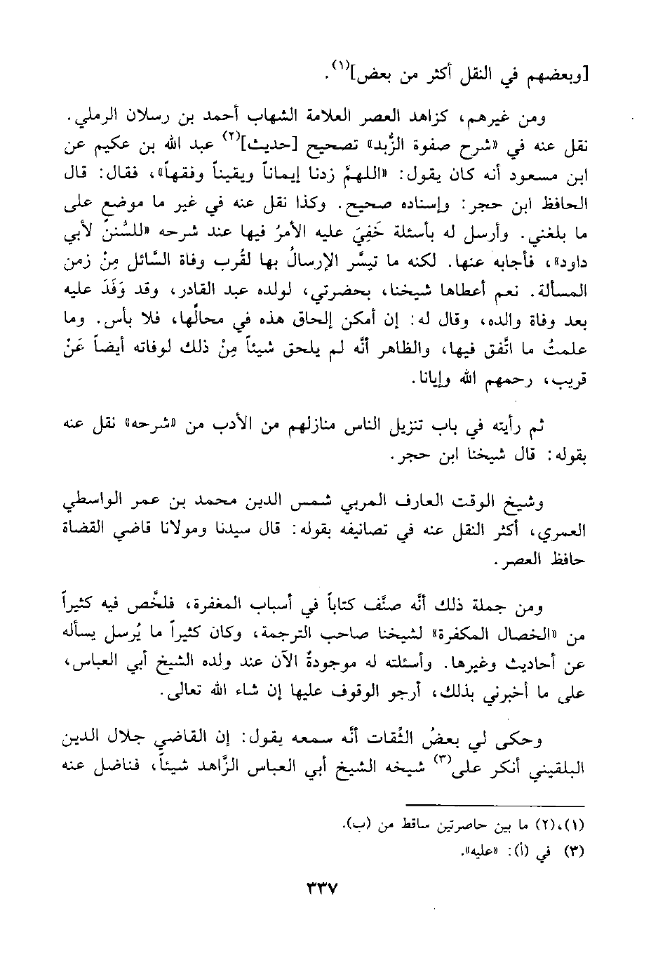 ومن غيرهم، كزاهد العصر العلامة الشهاب أحمد بن رسلان الرملي. نقل عنه في "شرح صفوة الزُّبد" تصحيح [حديث] (¬2) عبد اللَّه بن عكيم عن ابن مسعود أنه كان يقول: "اللهمَّ زدنا إيمانًا ويقينًا وفقهًا"، فقال: قال الحافظ ابن حجر: وإسناده صحيح. وكذا نقل عنه في غير ما موضعٍ على ما بلغني. وأرسل له بأسئلة خَفِيَ عليه الأمرُ فيها عند شرحه "للسُّنن لأبي داود"، فأجابه عنها. لكنه ما تيسَّر الإرسال بها لقرب وفاة السَّائل مِنْ زمن المسألة. نعم أعطاها شيخنا، بحضرتي، لولده عبد القادر، وقد وَفَدَ عليه بعد وفاة والده، وقال له؛ إن أمكن إلحاق هذه في محالِّها، فلا بأس. وما علمتُ ما اتَّفق فيها، والظاهر أنَّه لم يلحق شيئًا مِنْ ذلك لوفاته أيضًا عَن قريب، رحمهم اللَّه وإيانا.