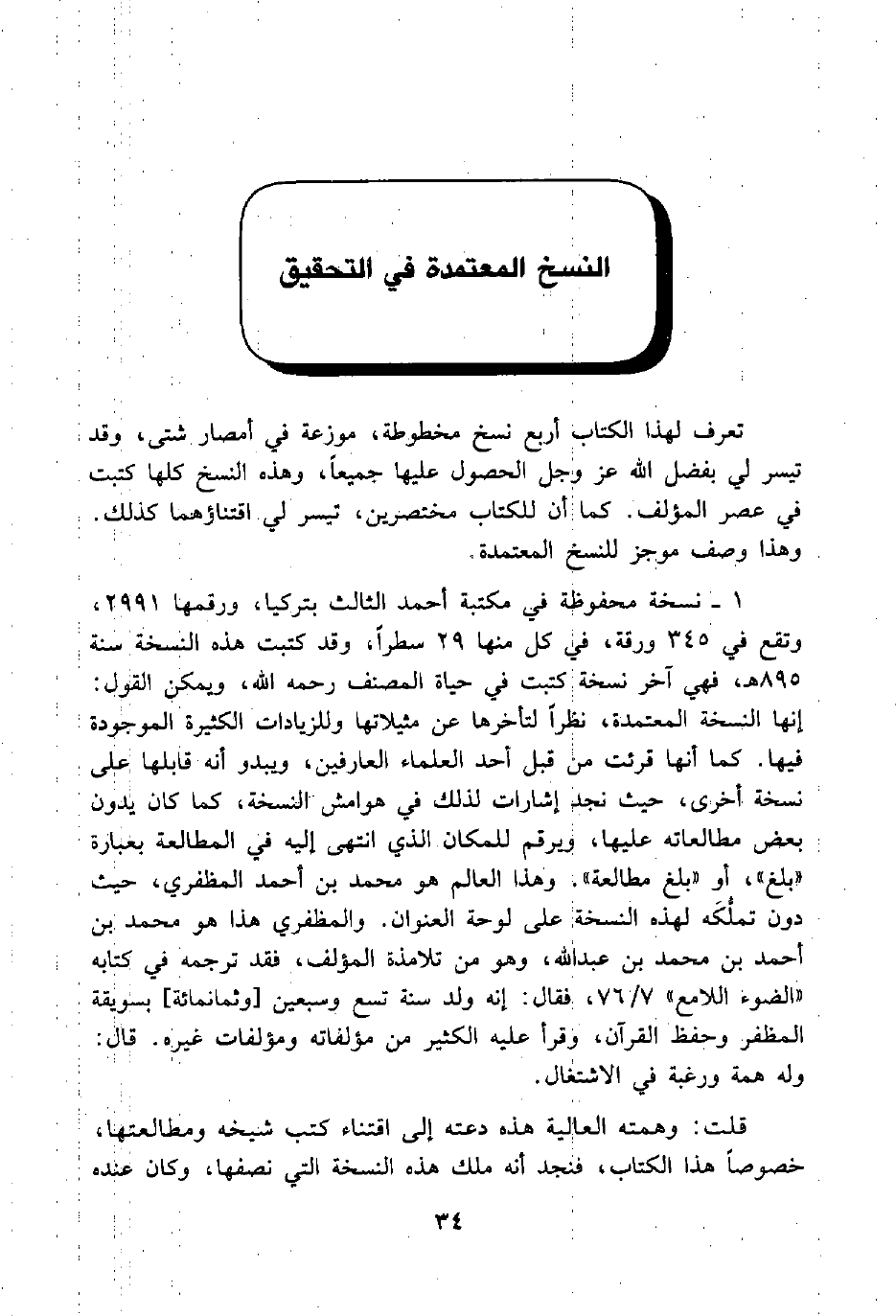 1 - نسخة محفوظة في مكتبة أحمد الثالث بتركيا، ورقمها 2991، وتقع في 345 ورقة، في كل منها 29 سطرًا، وقد كتبت هذه النسخة سنة 895 هـ، فهي آخر نسخة كتبت في حياة المصنف رحمه اللَّه، ويمكن القول: إنها النسخة المعتمدة، نظرًا لتأخرها عن مثيلاتها وللزيادات الكثيرة الموجودة فيها، كما أنها قرئت من قبل أحد العلماء العارفين، ويبدو أنه قابلها على نسخة أخرى، حيث نجد إشارات لذلك في هوامش النسخة، كما كان يدون بعض مطالعاته عليها، ويرقم للمكان الذي انتهى إليه في المطالعة بعبارة "بلغ"، أو"بلغ مطالعة". وهذا العالم هو محمد بن أحمد المظفري، حيث دون تملُّكَه لهذه النسخة على لوحة العنوان. والمظفري هذا هو محمد بن أحمد بن محمد بن عبد اللَّه، وهو من تلامذة المؤلف، فقد ترجمه في كتابه "الضوء اللامع" 7/ 76، فقال: إنه ولد سنة تسع وسبعين [وثمانمائة] بسويقة المظفر وحفظ القرآن، وقرأ عليه الكثير من مؤلفاته ومؤلفات غيره. قال: وله همة ورغبة في الاشتغال.