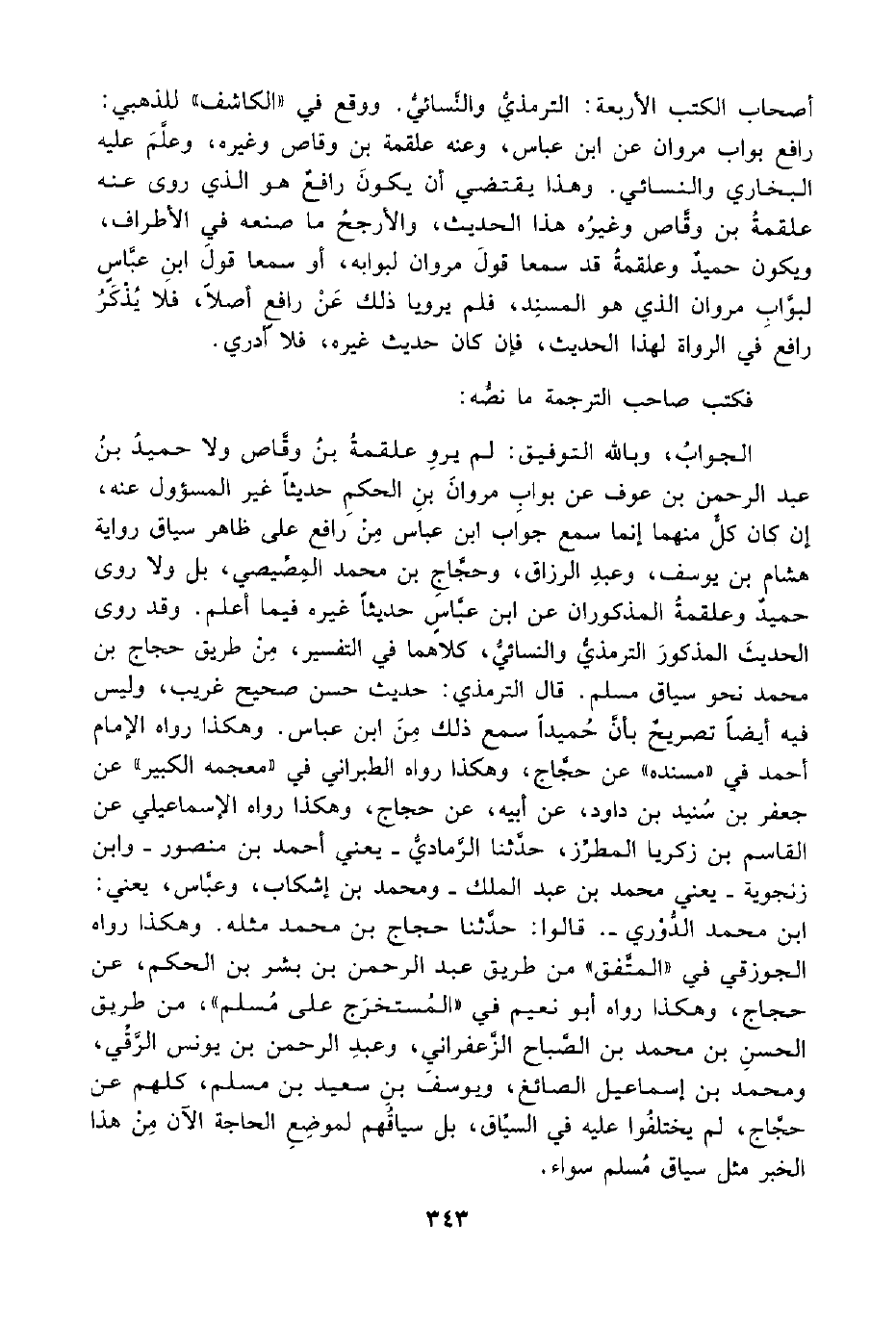 الجوابُ، وباللَّه التوفيق: لم يروِ علقمةُ بنُ وقَّاص ولا حميدُ بنُ عبد الرحمن بن عوف عن بوابِ مروانَ بنِ الحكم حديثًا غير المسؤول عنه، إن كان كلٌّ منهما إنما سمع جواب ابن عباس مِنْ رافع على ظاهر سياق رواية هشام بن يوسف، وعبدِ الرزاق، وحجَّاجِ بن محمد المِصِّيصي، بل ولا روى حميدٌ وعلقمةُ المذكوران عن ابن عبَّاسٍ حديثًا غيره فيما أعلم. وقد روى الحديثَ المذكورَ التِّرمذيُّ والنَّسائيُّ، كلاهما في التفسير، مِنْ طريق حجاج بن محمد نحو سياق مسلم. قال الترمذي: حديث حسن صحيح غريب، وليس فيه أيضًا تصريحٌ بأنَّ حُميدًا سمع ذلك مِنَ ابن عباس. وهكذا رواه الإمام أحمد في "مسنده" عن حجَّاج، وهكذا رواه الطبراني في "معجمه الكبير" عن جعفر بن سُنيد بن داود، عن أبيه، عن حجاج، وهكذا رواه الإسماعيلي عن القاسم بن زكريا المطرِّز، حدثنا الرَّماديُّ -يعني أحمد بن منصور- وابن زنجوية -يعني محمد بن عبد الملك- ومحمد بن إشكاب، وعبَّاس، يعني: ابن محمد الدُّوْري-. قالوا: حدَّثنا حجاج بن محمد مثله. وهكذا رواه الجوزقي في "المتَّفق" من طريق عبد الرحمن بن بشر بن الحكم، عن حجاج، وهكذا رواه أبو نعيم في "المُستخرَج على مُسلم"، من طريق الحسنِ بن محمد بن الصَّباح الزَّعفراني، وعبدِ الرحمن بن يونس الرَّقِّي، ومحمد بن إسماعيل الصائغ، ويوسفَ بنِ سعيد بن مسلم، كلهم عن حجَّاج، لم يختلفُوا عليه في السياق، بل سياقُهم لموضِعِ الحاجة الآن مِنْ هذا الخبر مثل سياق مُسلم سواء.