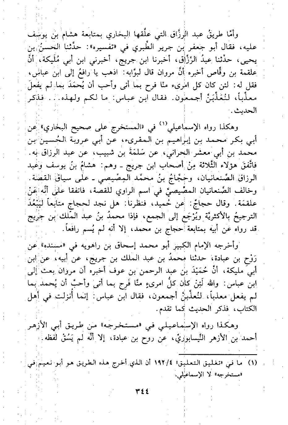وأمَّا طريقُ عبد الرَّزاق التي علَّقها البخاري بمتابعة هشام بن يوسف عليه، فقال أبو جعفر بن جرير الطَّبري في "تفسيره": حدَّثنا الحسنُ بن يحيى، حدَّثنا عبدُ الرَّزَّاق، أخبرنا ابن جريج، أخبرني ابن أبي مُلَيكة، أنَّ علقمة بن وقَّاص أخبره أنَّ مروان قال لبوَّابه: اذهب يا رافعُ إلى ابن عباس، فقل له: لئن كان كل أمرئ منّا فرح بما أتى وأحب أن يُحمَدَ بما لم يفعلَ معذَّبًا، لنُعَذَّبَنَّ أجمعون. فقال ابن عباس: مالكم ولهذه. . . فذكر الحديث.