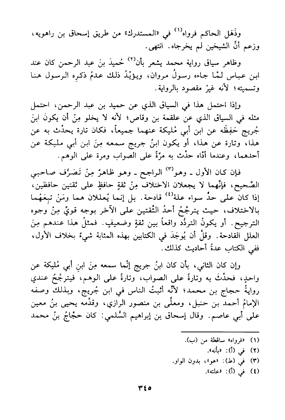 وإن كان الثاني، بأن كان ابنُ جريج إنَّما سمعه مِنَ ابنِ أبي مُليكة عن واحد، فحدَّثَ به وتارةً على الصواب، وتارةً على الوهم، فيترجَّحُ عندي روايةُ حجاج بن محمد؛ لأنَّه أثبتُ النَّاس في ابن جُريج، وبذلك وصفه الإمامُ أحمد بن حنبل، ومعلَّى بن منصور الرازي، وقدَّمه يحيى بنُ معين على أبي عاصم. وقال إسحاق بن إبراهيم السُّلمي: كان حجَّاجُ بنُ محمد