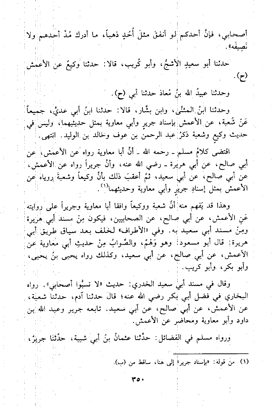 وحدثنا ابنُ المثنَّى، وابن بشَّار، قالا: حدثنا ابنُ أبي عديٍّ، جميعًا عَنْ شُعبة، عن الأعمش بإسناد جرير وأبي معاوية بمثل حديثيهما، وليس في حديث وكيع وشعبة ذكرُ عبد الرحمن بن عوف وخالد بن الوليد. انتهى.