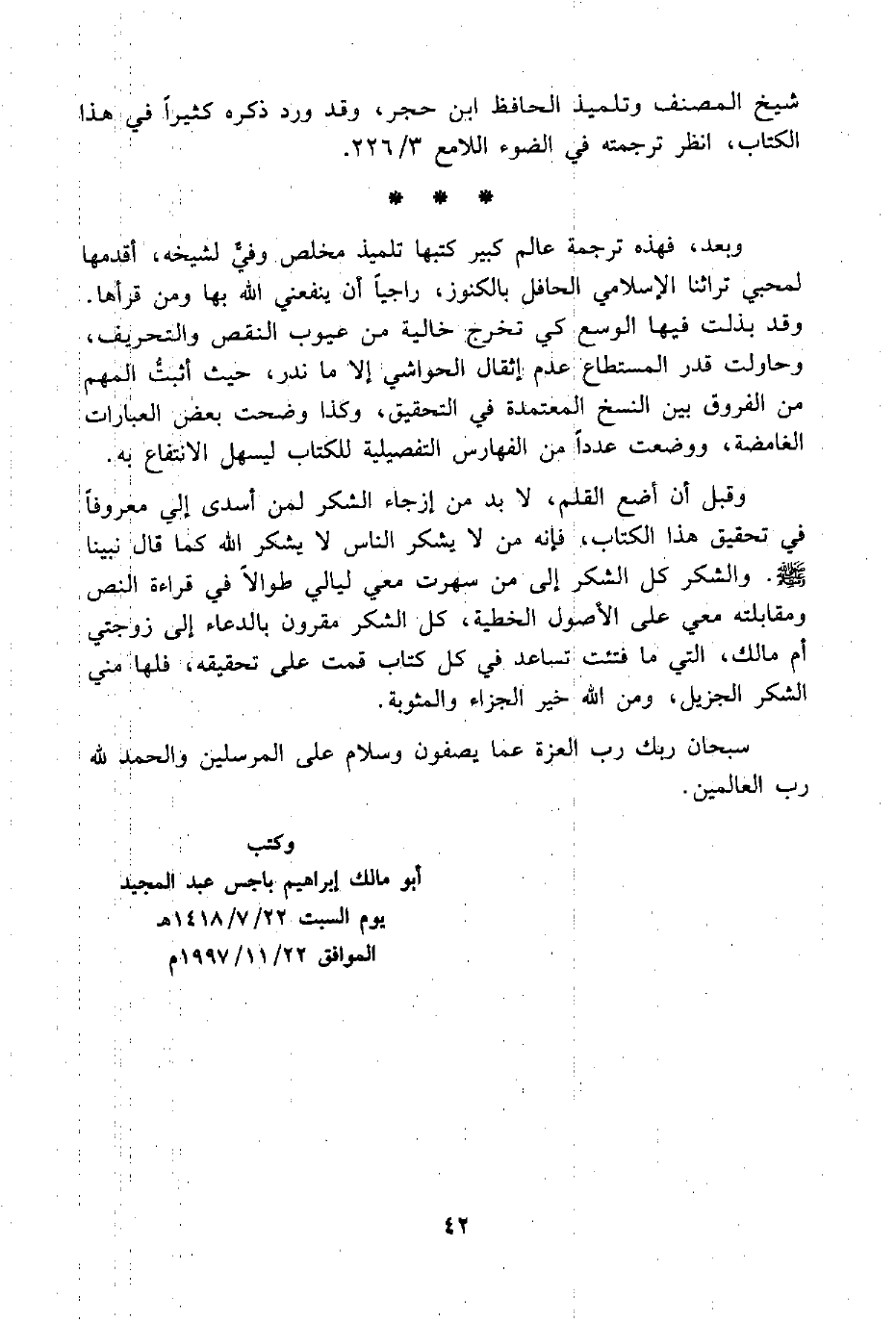 وبعد، فهذه ترجمة عالم كبير كتبها تلميذ مخلص وفيٌّ لشيخه، أقدمها لمحبي تراثنا الإسلامي الحافل بالكنوز، راجيًا أن ينفعني اللَّه بها ومن قرأها. وقد بذلت فيها الوسع كي تخرج خالية من عيوب النقص والتحريف، وحاولت قدر المستطاع عدم إثقال الحواشي إلا ما ندر، حيث أثبتُّ المهم من الفروق بين النسخ المعتمدة في التحقيق، وكذا وضحت بعض العبارات الغامضة، ووضعت عددًا من الفهارس التفصيلية للكتاب ليسهل الانتفاع به.