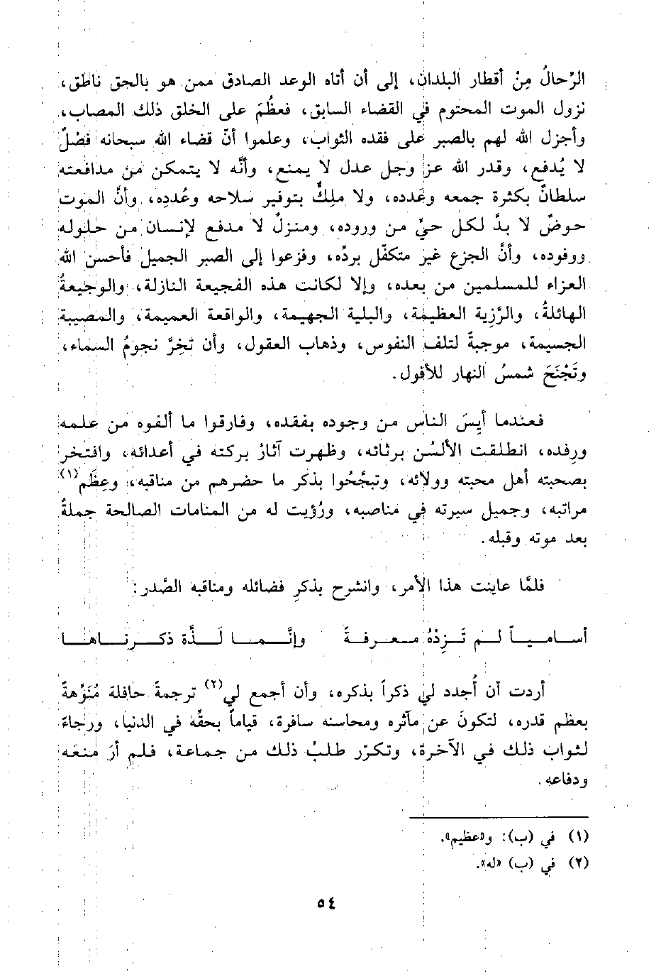 الرِّحالُ مِنْ أقطار البلدان، إلى أن أتاه الوعد الصادق ممن هو بالحق ناطق، نزول الموت المحتوم في القضاء السابق، فعظُمَ على الخلق ذلك المصاب، وأجزل اللَّه لهم بالصبر على فقده الثواب، وعلموا أنَّ قضاء اللَّه سبحانه فصْلٌ لا يُدفع، وقدر اللَّه عز وجل عدل لا يمنع، وأنَّه لا يتمكن من مدافعته سلطانٌ بكثرة جمعه وعَدده، ولا ملِكٌ بتوفير سلاحه وعُددِه، وأنَّ الموت حوضٌ لا بدَّ لكل حيٍّ من وروده، ومنزلٌ لا مدفع لإنسان من حلوله ووفوده، وأنَّ الجزع غير متكقل برده، وفزعوا إلى الصبر الجميل فأحسن اللَّه العزاء للمسلمين من بعده، وإلا لكانت هذه الفجيعة النازلة، والوجيعةُ الهائلةُ، والرَّزِية العظيمة، والبلية الجهيمة، والواقعة العميمة، والمصيبة الجسيمة، موجبةً لتلف النفوس، وذهاب العقول، وأن تخِرَّ نجومُ السماء، وتَجْنَحَ شمسُ النهار للأفول.
