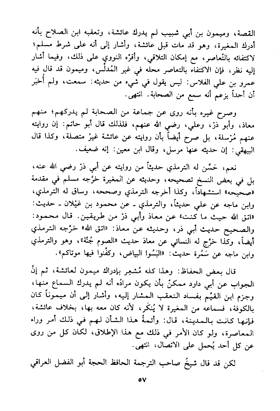القصة، وميمون بن أبي شبيب لم يدرك عائشة، وتعقبه ابن الصلاح بأنه أدرك المغيرة، وهو قد مات قبل عائشة، وأشار إلى أنه على شرط مسلم؛ لاكتفائه بالتَّعاصر، مع إمكان التلاقي، وأقرَّه النووي على ذلك، وفيما أشار إليه نظر، فإن الاكتفاء بالتعاصر محله في غير المُدلِّس، وميمون قد قال فيه عمرو بن علي الفلاس: ليس يقول في شيء من حديثه: سمعت، ولم أُخبَر أن أحدًا يزعم أنه سمع من الصحابة. انتهى.
