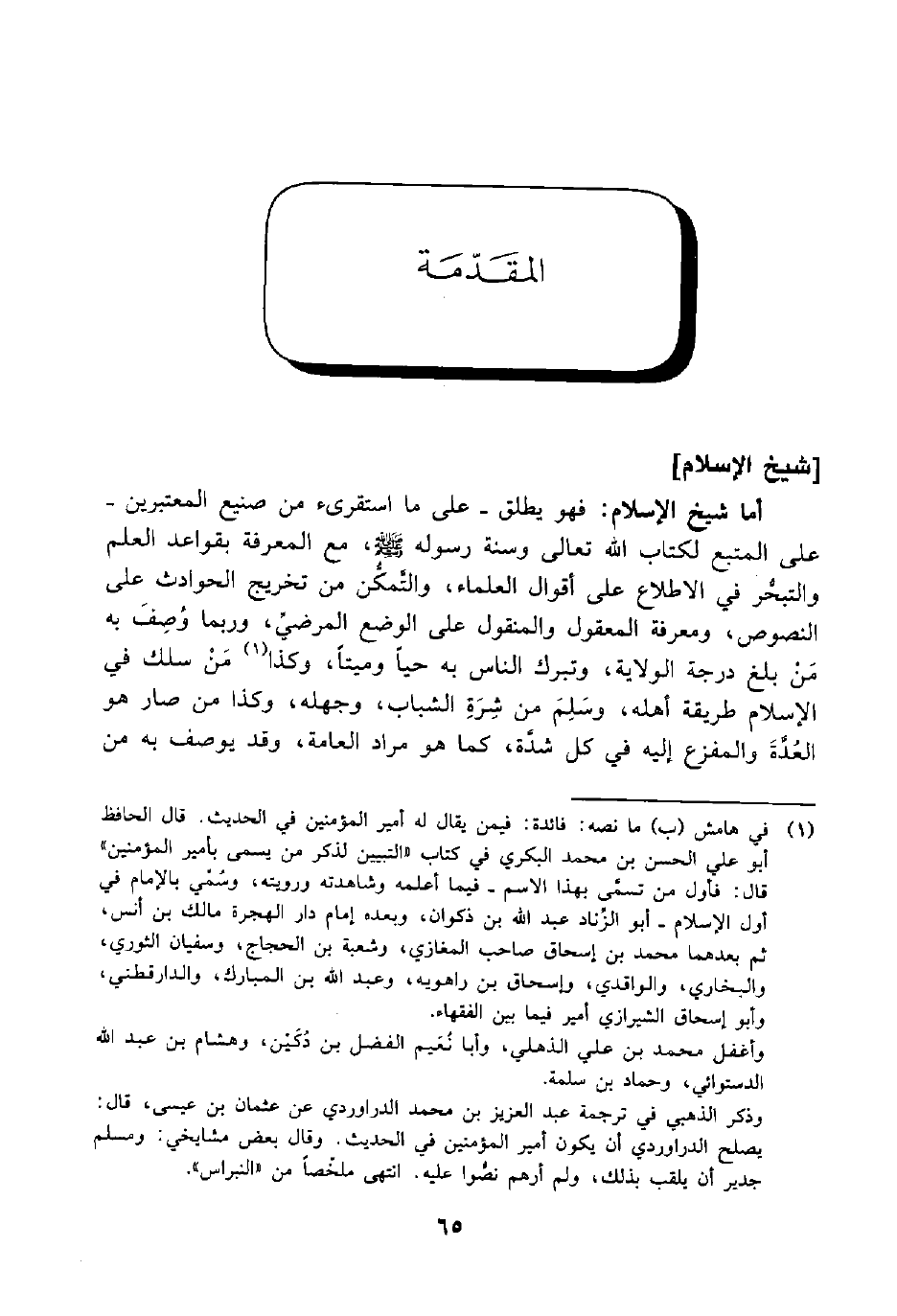 أما شيخ الإسلام: فهو يطلق -على ما استقرىء من صنيع المعتبرين- على المتبع لكتاب اللَّه تعالى وسنة رسوله -صلى اللَّه عليه وسلم-، مع المعرفة بقواعد العلم والتبحُّر في الاطلاع على أقوال العلماء، والتَّمكُّن من تخريج الحوادث على النصوص، ومعرفة المعقول والمنقول على الوضع المرضيِّ، وربما وُصِفَ به مَنْ بلغ درجة الولاية، وتبرك الناس به حيًّا وميتًا، وكذا (¬1) مَنْ سلك في الإسلام طريقة أهله، وسَلِمَ من شِرَةِ الشباب، وجهله، وكذا من صار هو العُدَّةَ والمفزع إليه في كل شدَّة، كما هو مراد العامة، وقد يوصف به من