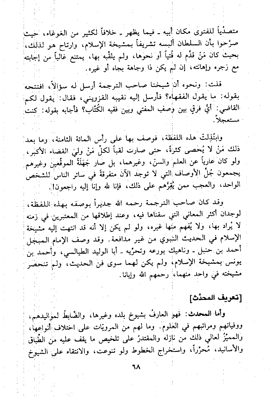 وأما المحدث: فهو العارفُ بشيوخ بلده وغيرها، والضَّابطُ لمواليدهم، ووفياتهم ومراتبهم في العلوم. وما لهم من المرويات على اختلاف أنواعها، والمميِّزُ لعالي ذلك من نازله والمقتدرُ على تلخيص ما يقف عليه من الطِّباق والأسانيد، مُحرَّرًا، واستخراج الخطوط ولو تنوعت، والانتقاء على الشيوخ