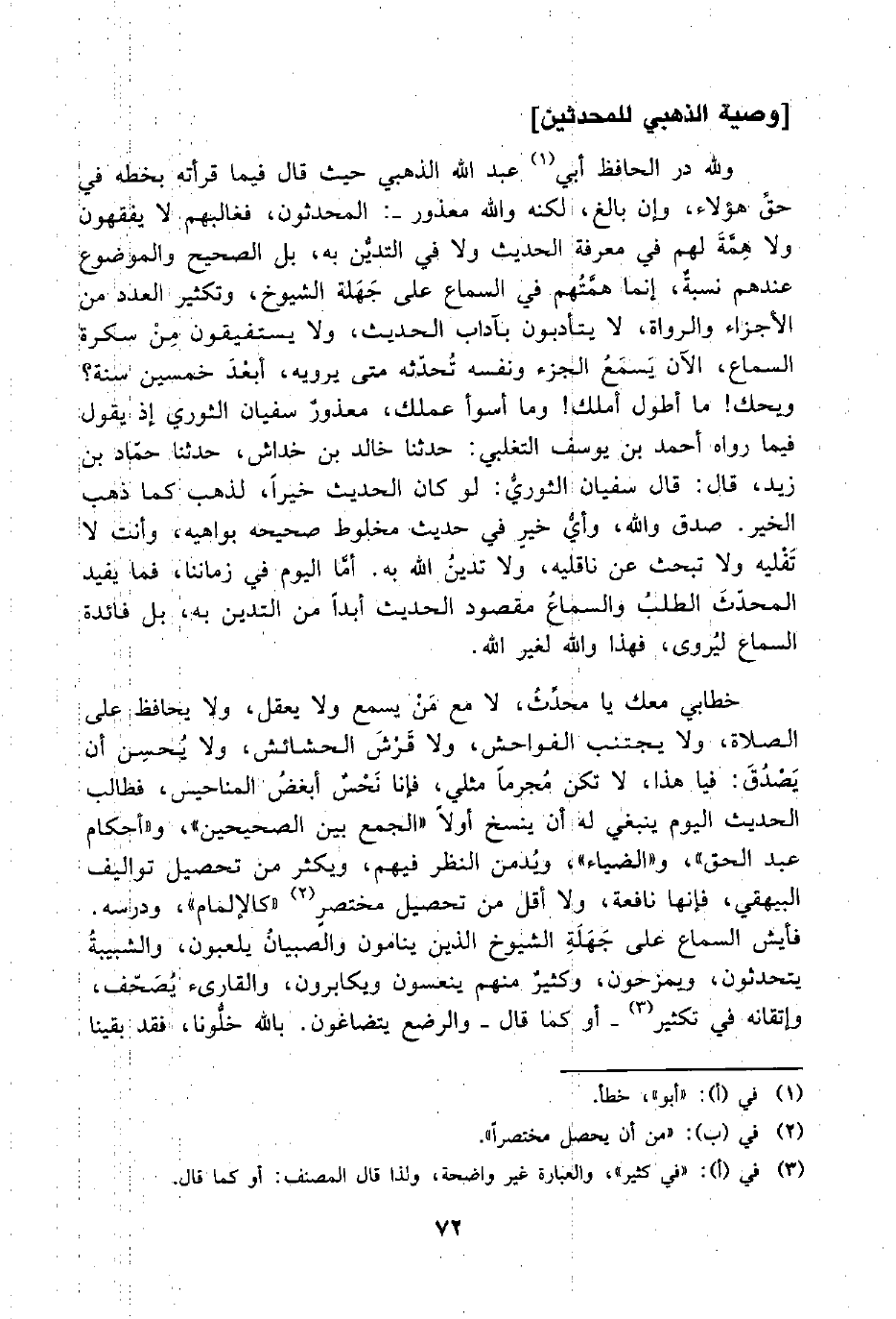 خطابي معك يا محدِّث، لا مع مَنْ يسمع ولا يعقل، ولا يحافظ على الصلاة، ولا يجتنب الفواحش، ولا قَرْشَ الحشائش، ولا يُحسِن أن يَصْدُقَ: فيا هذا، لا تكن مُجرمًا مثلي، فإنا نَحْسٌ أبغضُ المناحيس، فطالب الحديث اليوم ينبغي له أن ينسخ أولًا "الجمع بين الصحيحين"، و"أحكام عبد الحق"، و"الضياء"، ويُدمن النظر فيهم، ويكثر من تحصيل تواليف البيهقي، فإنها نافعة، ولا أقل من تحصيل مختصرٍ (¬2) "كالإلمام"، ودرسه. فأيش السماع على جَهَلَةِ الشيوخ الذين ينامون والصبيانُ يلعبون، والشبيبةُ يتحدثون، ويمزحون، وكثيرٌ منهم ينعسون ويكابرون، والقارىء يُصَحّف، وإتقانه في تكثير (¬3) -أو كما قال- والرضع يتضاغون. باللَّه خلُّونا، فقد بقينا