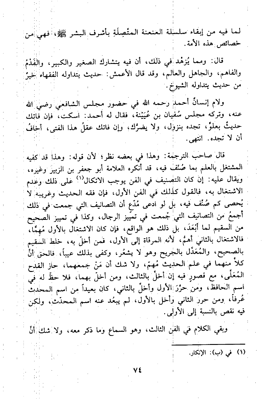 قال صاحب الترجمة: وهذا في بعضه نظر؛ لأن قوله: وهذا قد كفيه المشتغل بالعلم بما صُنِّف فيه، قد أنكره العلامة أبو جعفر بن الزبير وغيره، ويقال عليه: إن كان التصنيف في الفن يوجب الاتكال (¬1) على ذلك وعدم الاشتغال به، فالقول كذلك في الفن الأول، فإن فقه الحديث وغريبه لا يُحصى كم صُنِّف فيه، بل لو ادعى مُدّع أن التصانيف التي جمعت في ذلك أجمعُ من التصانيف التي جُمعت في تخيير الرجال، وكذا في تمييز الصحيح من السقيم لما أبْعَدَ، بل ذلك هو الواقع، فإن كان الاشتغال بالأول مُهِمًّا، فالاشتغال بالثاني أهمُّ، لأنه المرقاة إلى الأول، فمن أخلّ به، خلط السقيم بالصحيح، والمُعَدَّل بالجريح وهو لا يشعُر، وكفى بذلك عيبًا، فالحق أن كلًّا منهما في علم الحديث مُهمّ، ولا شك أن مَن جمعهما، حاز القدح المُعَلَّى، مع قصورٍ فيه إن أخلَّ بالثالث، ومن أخلّ بهما، فلا حظّ له في اسم الحافظ، ومن حرَّرَ الأول وأخلَّ بالثاني، كان بعيدًا من اسم المحدث عُرفًا، ومن حرر الثاني وأخل بالأول، لم يبعُد عنه اسم المحدّث، ولكن فيه نقص بالنسبة إلى الأولى.