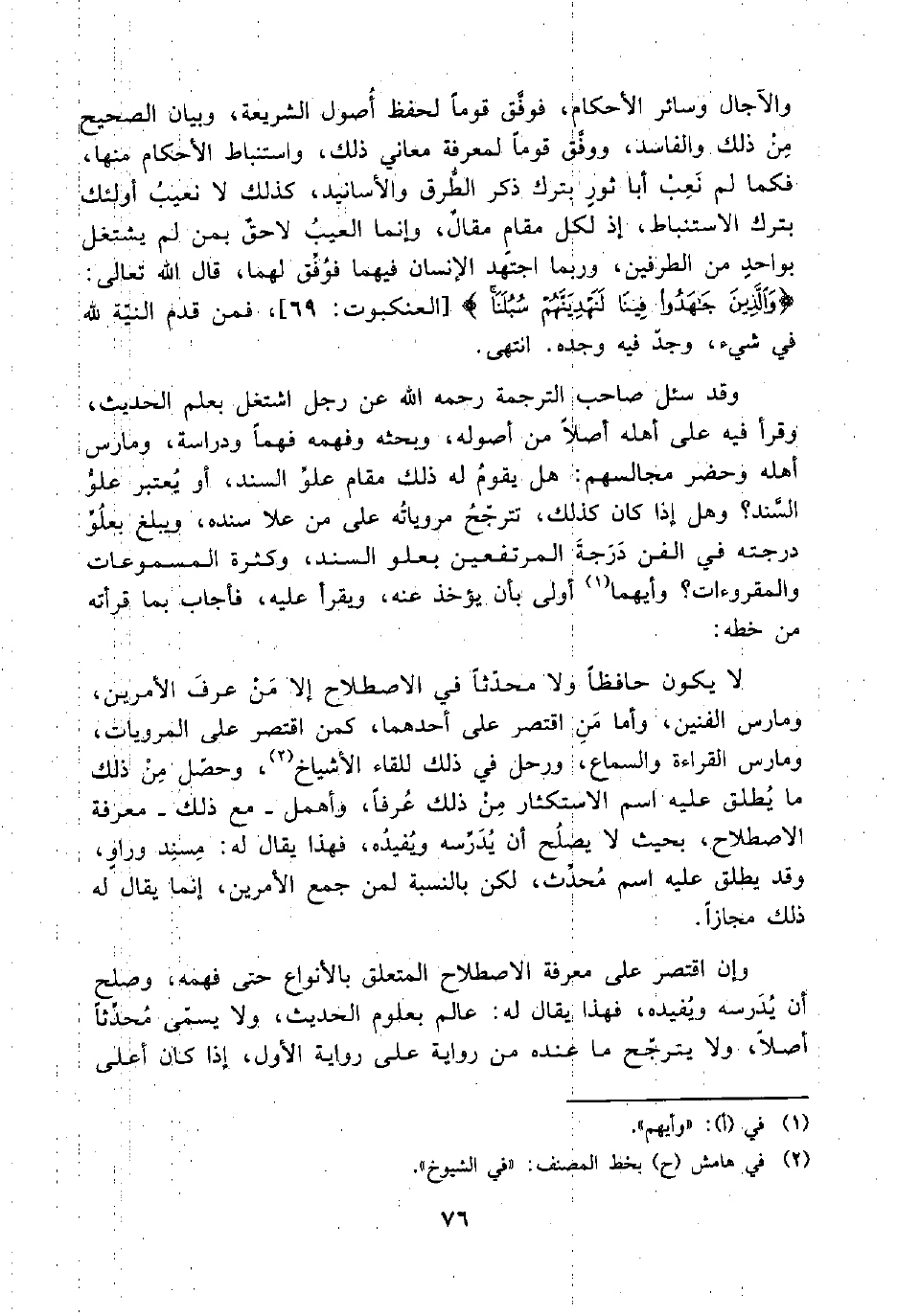والآجال وسائر الأحكام، فوفَّق قومًا لحفظ أُصول الشريعة، وبيان الصحيح مِنْ ذلك والفاسد، ووفَّق قومًا لمعرفة معاني ذلك، واستنباط الأحكام منها، فكما لم نَعِبْ أبا ثورٍ بترك ذكر الطُّرق والأسانيد، كذلك لا نعيبُ أولئك بترك الاستنباط، إذ لكل مقام مقالٌ، وإنما العيبُ لاحقٌ بمن لم يشتغل بواحدٍ من الطرفين، وربما اجتهد الإنسان فيهما فوُفِّق لهما، قال اللَّه تعالى: {وَالَّذِينَ جَاهَدُوا فِينَا لَنَهْدِيَنَّهُمْ سُبُلَنَا} [العنكبوت: 69]، فمن قدم النيّة للَّه في شيء، وجدّ فيه وجده. انتهى.