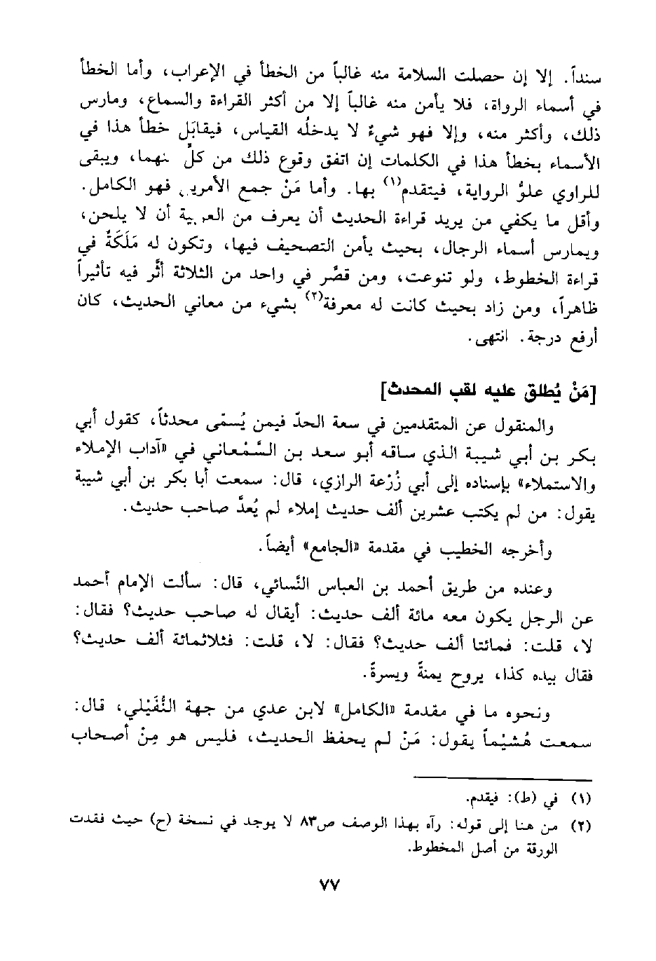 والمنقول عن المتقدمين في سعة الحدّ فيمن يُسمّى محدثًا، كقول أبي بكر بن أبي شيبة الذي ساقه أبو سعد بن السَّمْعاني في "آداب الإملاء والاستملاء" بإسناده إلى أبي زُرْعة الرازي، قال: سمعت أبا بكر بن أبي شيبة يقول: من لم يكتب عشرين ألف حديث إملاء لم يُعدَّ صاحب حديث.