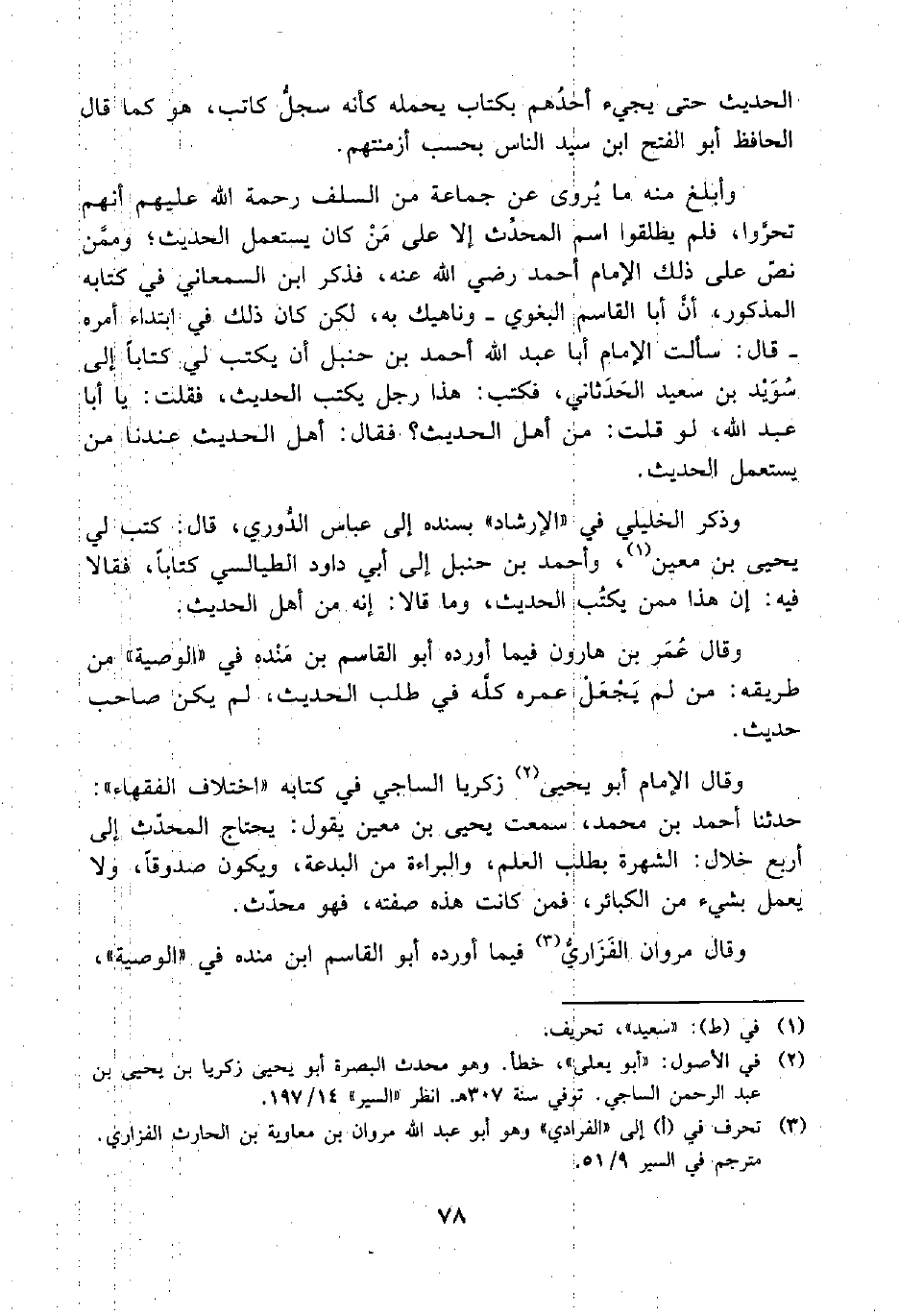 وأبلغ منه ما يُروى عن جماعة من السلف رحمة اللَّه عليهم أنهم تحرَّوا، فلم يطلقوا اسم المحدث إلا على مَنْ كان يستعمل الحديث؛ وممَّن نصّ على ذلك الإمام أحمد رضي اللَّه عنه، فذكر ابن السمعاني في كتابه المذكور، أنَّ أبا القاسم البغوي -وناهيك به، لكن كان ذلك في ابتداء أمره- قال: سألت الإمام أبا عبد اللَّه أحمد بن حنبل أن يكتب لي كتابًا إلى سُوَيْد بن سعيد الحَدَثاني، فكتب: هذا رجل يكتب الحديث، فقلت: يا أبا عبد اللَّه، لو قلت: من أهل الحديث؛ فقال: أهل الحديث عندنا من يستعمل الحديث.