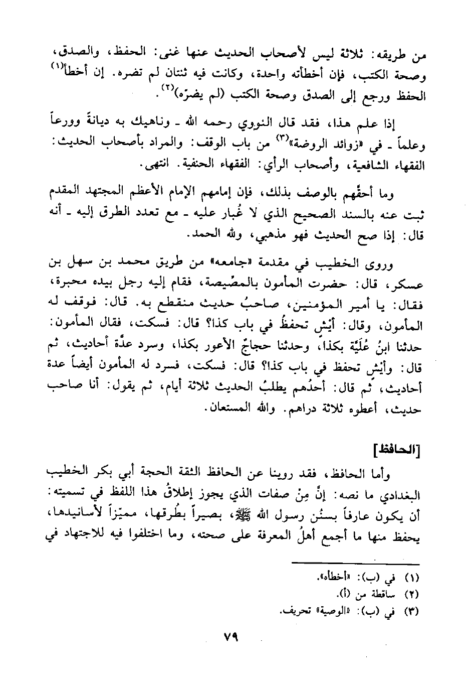 وأما الحافظ، فقد روينا عن الحافظ الثقة الحجة أبي بكر الخطيب البغدادي ما نصه: إنَّ مِنْ صفات الذي يجوز إطلاقُ هذا اللفظ في تسميته: أن يكون عارفًا بسنُن رسول اللَّه -صلى اللَّه عليه وسلم-، بصيرًا بطُرقها، مميّزًا لأسانيدها، يحفظ منها ما أجمع أهلُ المعرفة على صحته، وما اختلفوا فيه للاجتهاد في