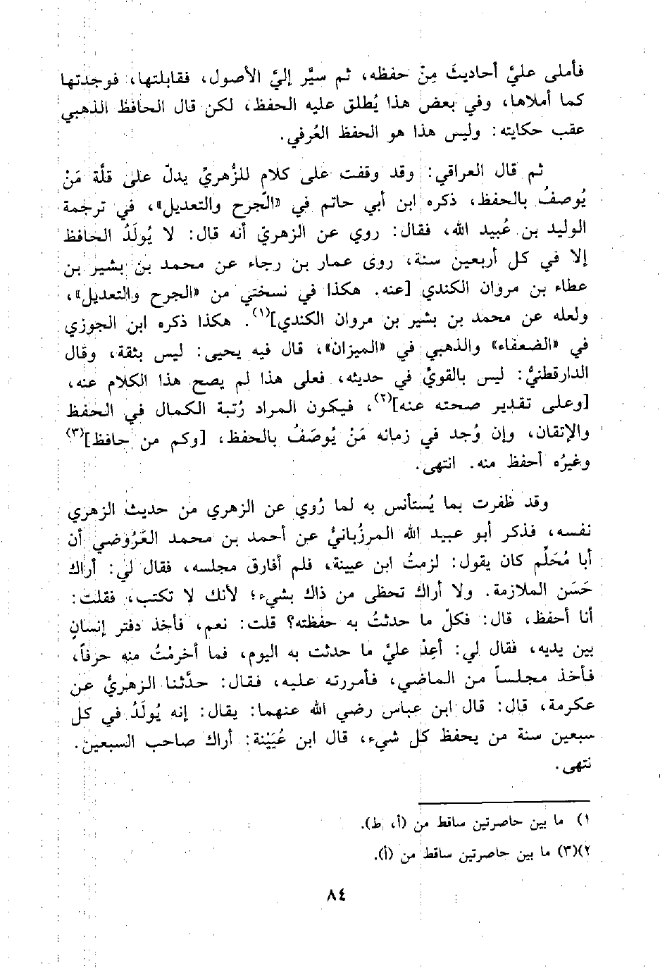 ثم قال العراقي: وقد وقفت على كلام للزُّهريِّ يدلّ على قلَّة مَنْ يُوصفُ بالحفظ، ذكره ابن أبي حاتم في "الجرح والتعديل"، في ترجمة الوليد بن عُبيد اللَّه، فقال: روي عن الزهريّ أنه قال: لا يُولَدُ الحافظ إلا في كل أربعين سنة، روى عمار بن رجاء عن محمد بن بشير بن عطاء بن مروان الكندي [عنه. هكذا في نسختي من "الجرح والتعديل"، ولعله عن محمد بن بشير بن مروان الكندي] (¬1). هكذا ذكره ابن الجوزي في "الضعفاء" والذهبي في "الميزان"، قال فيه يحيى: ليس بثقة، وقال الدارقطنيُّ: ليس بالقويِّ في حديثه، فعلى هذا لم يصح هذا الكلام عنه، [وعلى تقدير صحته عنه] (¬2)، فيكون المراد رُتبة الكمال في الحفظ والإتقان، وإن وُجد في زمانه مَنْ يُوصَفُ بالحفظ، [وكم من حافظ] (¬3) وغيرُه أحفظ منه. انتهى.