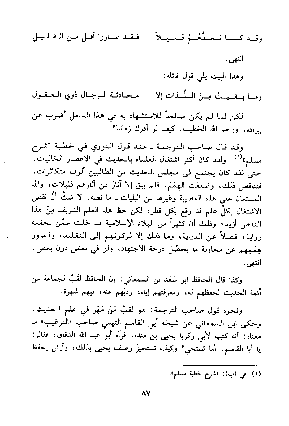 وقد قال صاحب الترجمة -عند قول النووي في خطبة "شرح مسلم" (¬1): ولقد كان أكثر اشتغال العلماء بالحديث في الأعصار الخاليات، حتى لقد كان يجتمع في مجلس الحديث من الطالبين ألوف متكاثرات، فتناقص ذلك، وضعفت الهِمَمُ، فلم يبق إلا آثارٌ من آثارهم قليلات، واللَّه المستعان على هذه المصيبة وغيرها من البليات- ما نصه: لا شك أن نقص الاشتغال بكلِّ علم قد وقع بكل قطر، لكن حظ هذا العلم الشريف مِنْ هذا النقص أزيد؛ وذلك أن كثيرًا من البلاد الإسلامية قد خلت عمَّن يحققه رواية، فضلًا عن الدراية، وما ذلك إلا لركونهم إلى التقليد، وقصور هِمَمِهم عن محاولة ما يحصِّل درجة الاجتهاد، ولو في بعض دون بعض. انتهى.