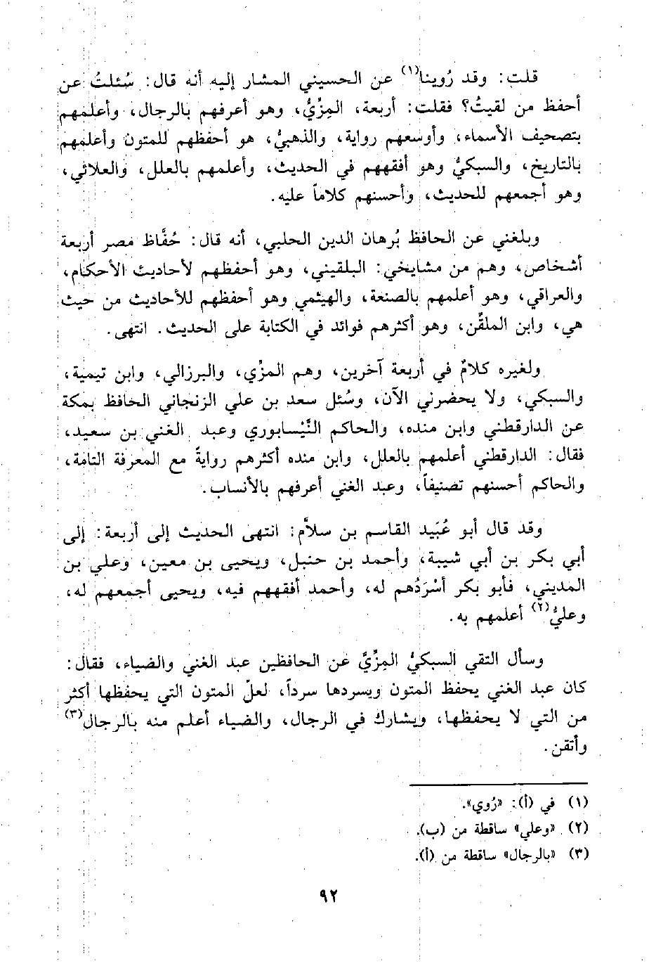 ولغيره كلامٌ في أربعة آخرين، وهم المزِّي، والبرزالي، وابن تيمية، والسبكي، ولا يحضرني الآن، وسُئل سعد بن علي الزنجاني الحافظ بمكة عن الدارقطني وابن منده، والحاكم النيسابوري وعبد الغني بن سعيد، فقال: الدارقطني أعلمهم بالعلل، وابن منده أكثرهم روايةً مع المعرفة التامة، والحاكم أحسنهم تصنيفًا، وعبد الغني أعرفهم بالأنساب.