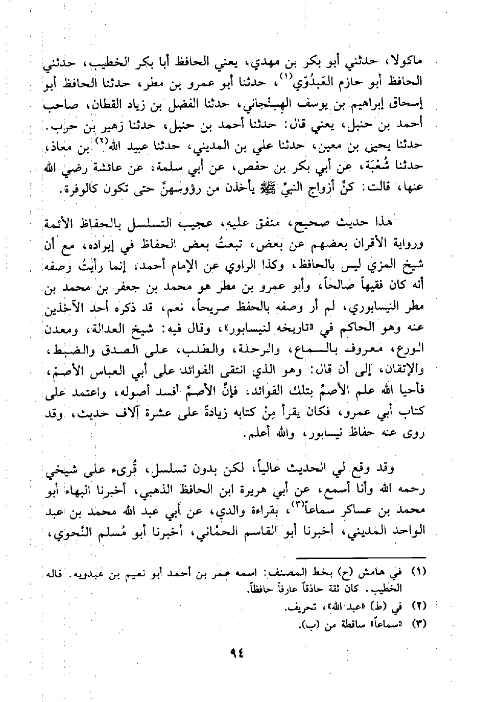 ماكولا، حدثني أبو بكر بن مهدي، يعني الحافظ أبا بكر الخطيب، حدثني الحافظ أبو حازم العَبدُوّي (¬1)، حدثنا أبو عمرو بن مطر، حدثنا الحافظ أبو إسحاق إبراهيم بن يوسف الهِسِنْجاني، حدثنا الفضل بن زياد القطان، صاحب أحمد بن حنبل، يعني قال: حدثنا أحمد بن حنبل، حدثنا زهير بن حرب. حدثا يحيى بن معين، حدثنا علي بن المديني، حدثنا عبيد اللَّه (¬2) بن معاذ، حدثنا شُعْبَة، عن أبي بكر بن حفص، عن أبي سلمة، عن عائشة رضي اللَّه عنها، قالت: كنَّ أزواج النبيِّ -صلى اللَّه عليه وسلم- يأخذن من رؤوسهنَّ حتى تكون كالوفرة.