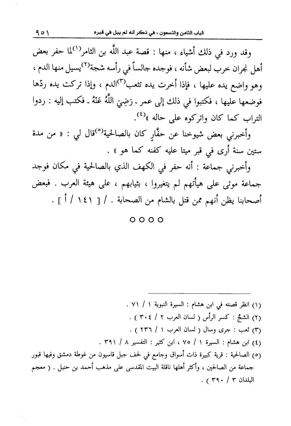 وقد ورد في ذلك أشياء، منها: قصة عبد الله بن الثّامر1 لما حفر بعض أهل نجران خرب لبعض شأنه، فوجده جالساً في رأسه شجّه2 يسيل منها الدم، وهو واضع يده عليها، فإذا أخرت يده تثعب3 الدم وإذا تركت يده ردّها فوضعها عليها، فكتبوا في ذلك إلى عمر رضي الله عنه فكتب إليه: ردّوا التراب كما كان واتركوه على حاله"4.