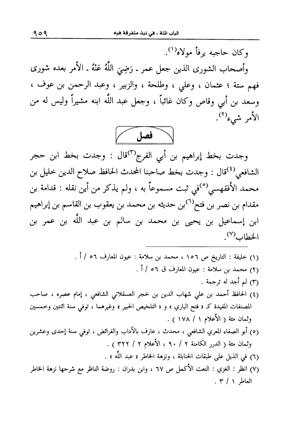 وجدت بخط إبراهيم بن أبي الفرج3 قال: وجدت بخط ابن حجر الشافعي4 قال: وجدت بخط صاحبنا المحدّث الحافظ صلاح الدين خليل ابن محمّد الأفقهسي5 في ثبت مسموعاً به، ولم يذكر من أين نقله: قدامة ابن مقدام بن نصر بن فتح6 بن حديثه بن محمّد بن يعقوب بن القاسم بن إبراهيم بن إسماعيل بن يحيى بن محمّد بن سالم بن عبد الله بن عمر الخطاب7.