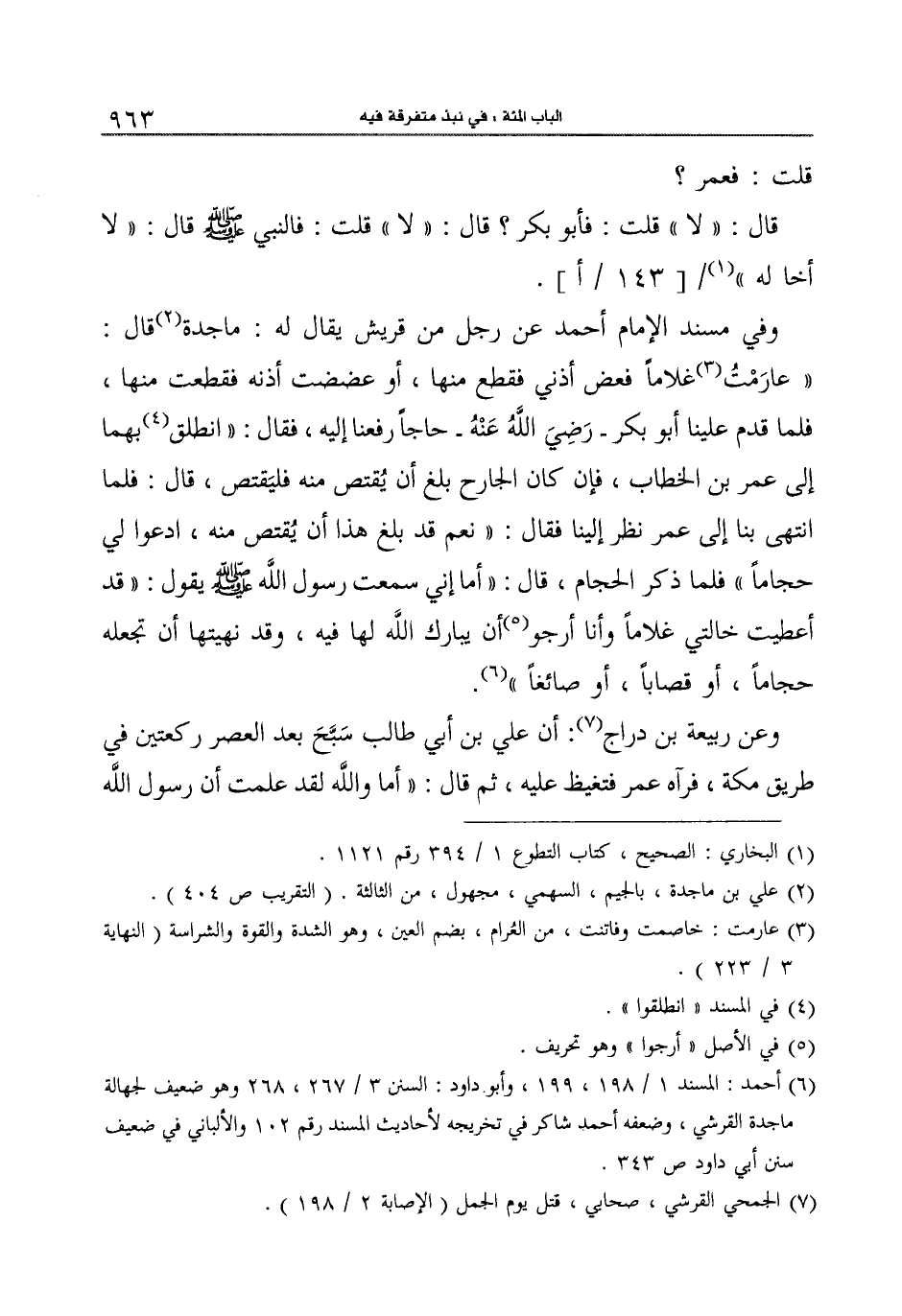 6 أحمد: المسند 1/198، 199، وأبو داود: السنن 3/267، 268، وهو ضعيف لجهالة ماجدة القرشي، وضعّفه أحمد شاكر في تخريجه لأحاديث المسند، رقم: 102، والألباني في ضعيف سنن أبي داود ص 343.