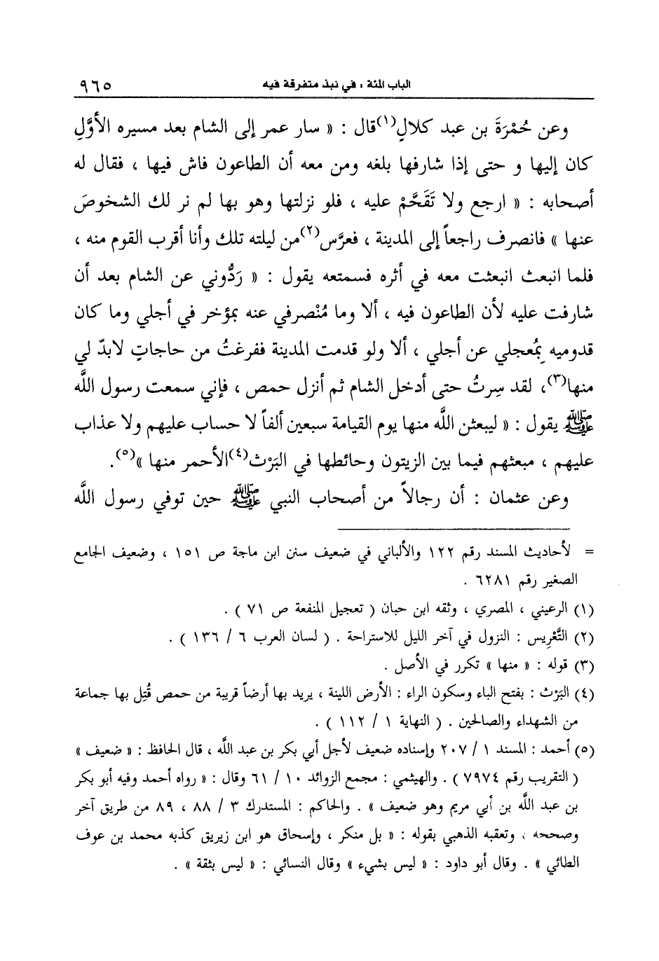 وعن حُمْرَة بن عبد كلالٍ1 قال: "سار عمر إلى الشام بعد مسيره الأوّل كان إليها وحتى إذا شارفها بلغه ومن معه أن الطاعون فاش فيها، فقال له أصحابه: "ارجع ولا تَقَحَّم عليه، فلو نزلتها وهو بها لم نر لك الشّخوصَ عنها". فانصرف راجعاً إلى المدينة، فعرّس2 من ليلته وأنا أقرب القوم منه، فلما انبعث انبعثت معه في أثره فسمعته يقول: "رَدُّوني عن الشام بعد أن شافرت عليه لأن الطاعون فيه، ألا وما مُنْصرفي عنه بمؤخر في أجلي وما كان قدوميه بِمُعجلي عن أجلي، ألا ولو قدمت المدينة ففرغتُ من حاجات لا بدّ لي منها3، لقد سِرتُ حتى أدخل الشام ثم أنزل حمص، فإني سمعت رسول الله صلى الله عليه وسلم يقول: "ليبعثن الله منها يوم القيامة سبعين ألفاً لا حساب عليهم ولا عذاب عليهم، مبعثهم فيما بين الزيتون وحائطها في البَرْث4 الأحمر منها "5.