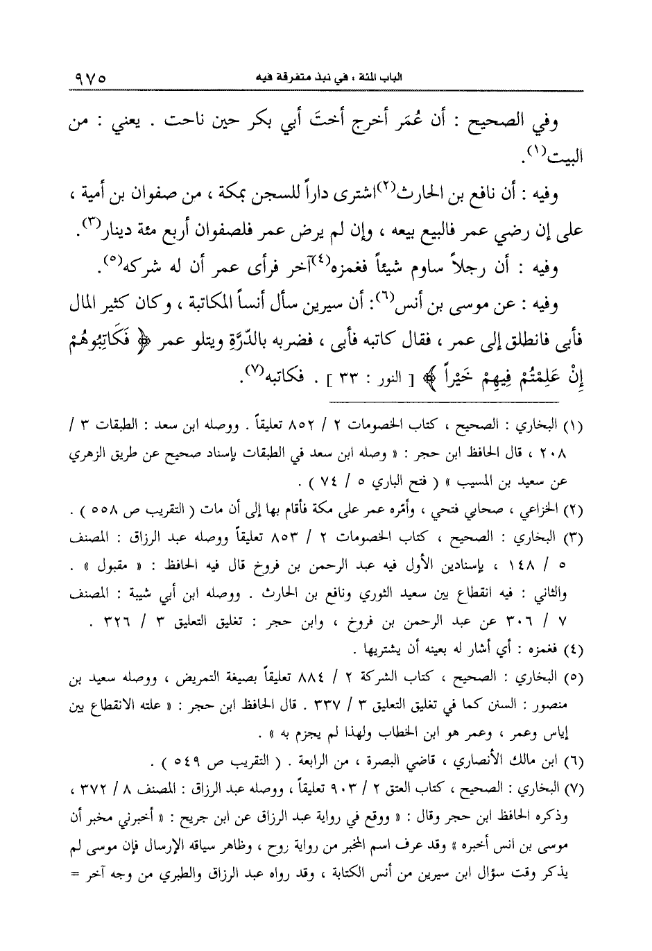 3 البخاري: الصحيح، كتاب الخصومات2/853، تعليقاً، ووصله عبد الرزاق: المصنف 5/148، بإسنادين: الأوّل فيه عبد الرحمن بن فروخ، قال فيه الحافظ: "مقبول". والثاني فيه انقطاع يبن سعيد الثوري، ونافع بن الحارث. ووصله ابن أبي شيبة: المصنف 7/306، عن عبد الرحمن بن فروخ، وابن حجر تغليق التعليق 3/326.