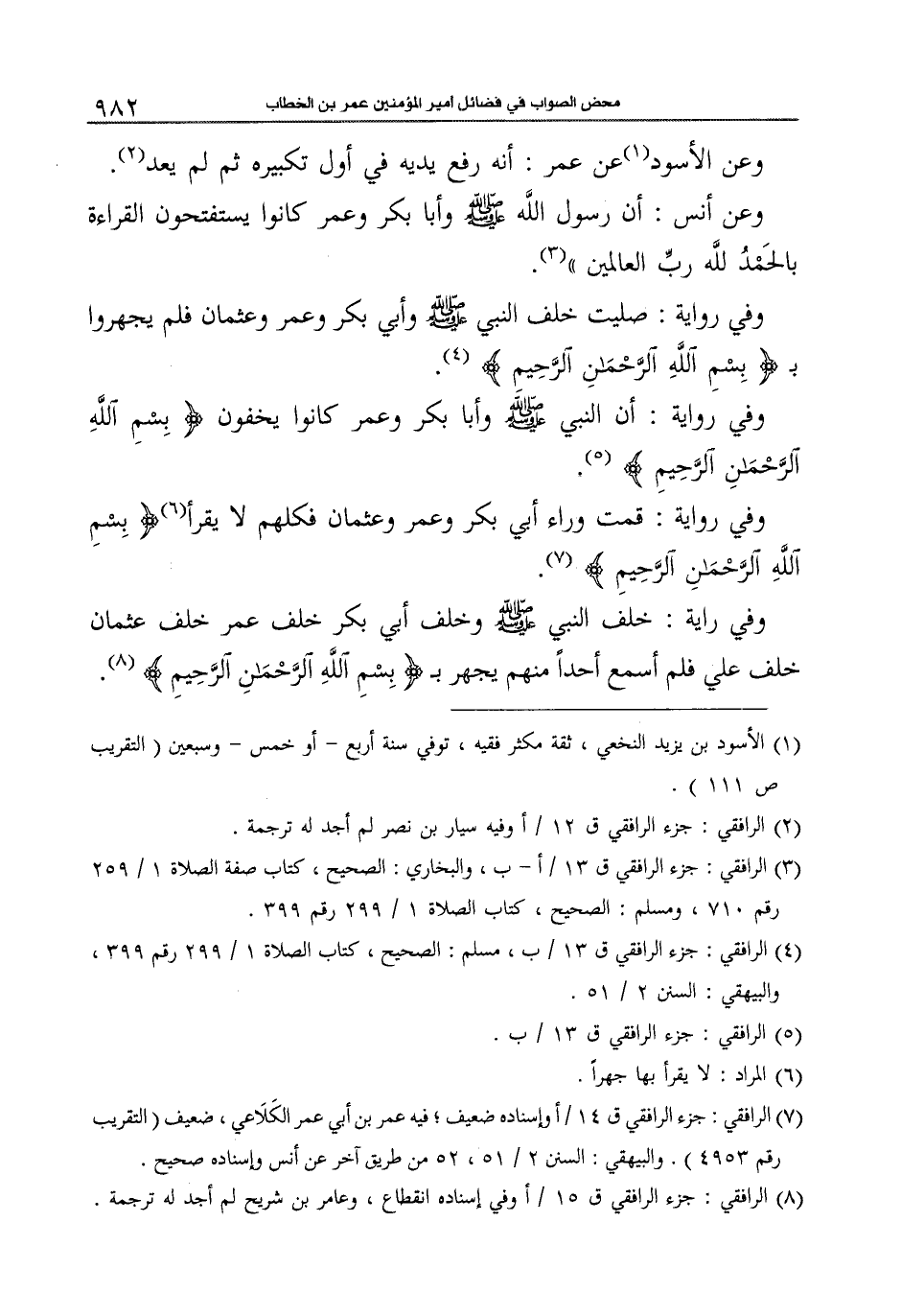 وفي رواية: قمت وراء أبي بكر وعمر وعثمان فكلّهم لا يقرأ6 {بِسْمِ الله الرَّحْمَنِ الرَّحِيمِ} 7.