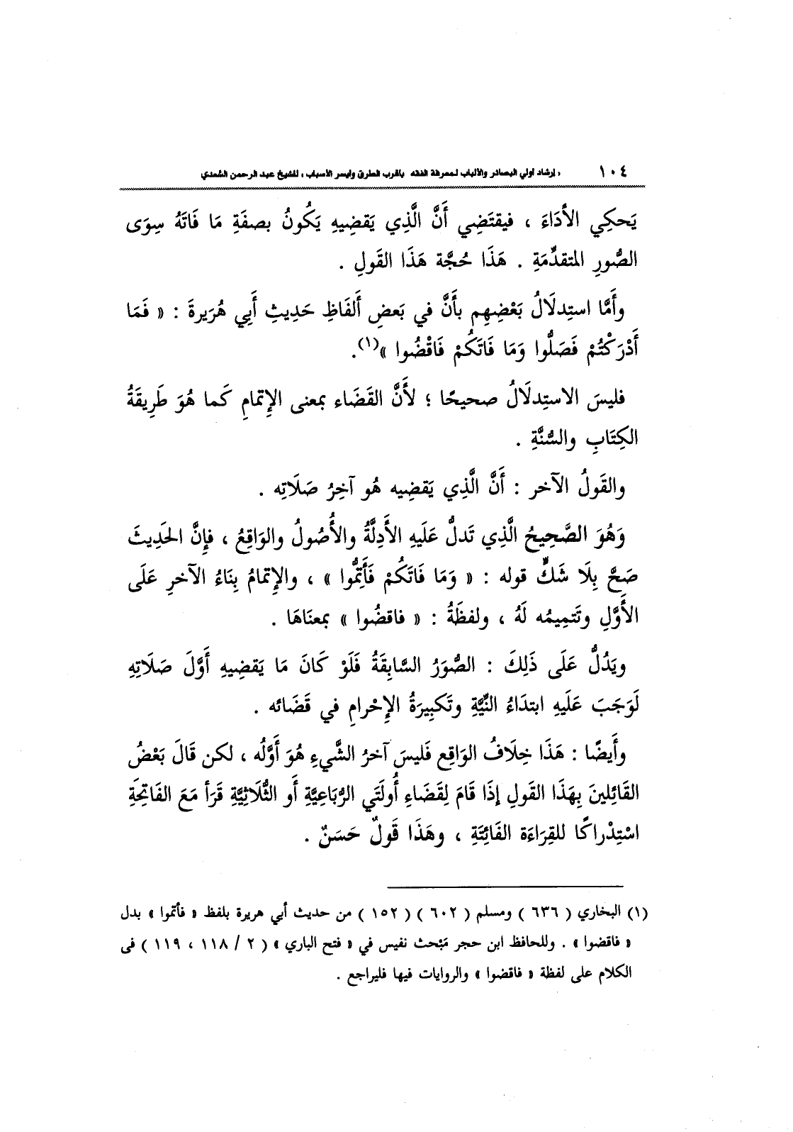 وَهُوَ الصَّحِيحُ الَّذِي تَدل عَلَيهِ الأَدِلَّةُ والأُصُولُ والوَاقِعُ، فإِنّ اَلْحَدِيث صَح بِلا شَكّ قوله: «وَمَا فَاتَكُمْ فأتموا» ، والإتمامُ بِنَاءُ الآخرِ على الأوَّلِ وتَتمِيمُه لَهُ، ولفظَةُ: «فاقضُوا» بمعنَاهَا.
