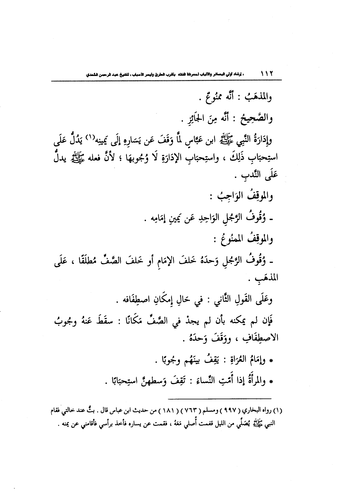 وإِدَارَةُ النَّبِي - صلى الله عليه وسلم - ابن عَباسٍ لما وَقَفَ عَن يَسَارِه إلَى يَمينِه يَدُلُّ على استِحبَابِ ذَلِكَ، واستِحبَابِ اَلْإِدَارَة لا وُجُوبهَا؛ لأنَّ فعله - صلى الله عليه وسلم - يدلُّ على النَّدبِ.