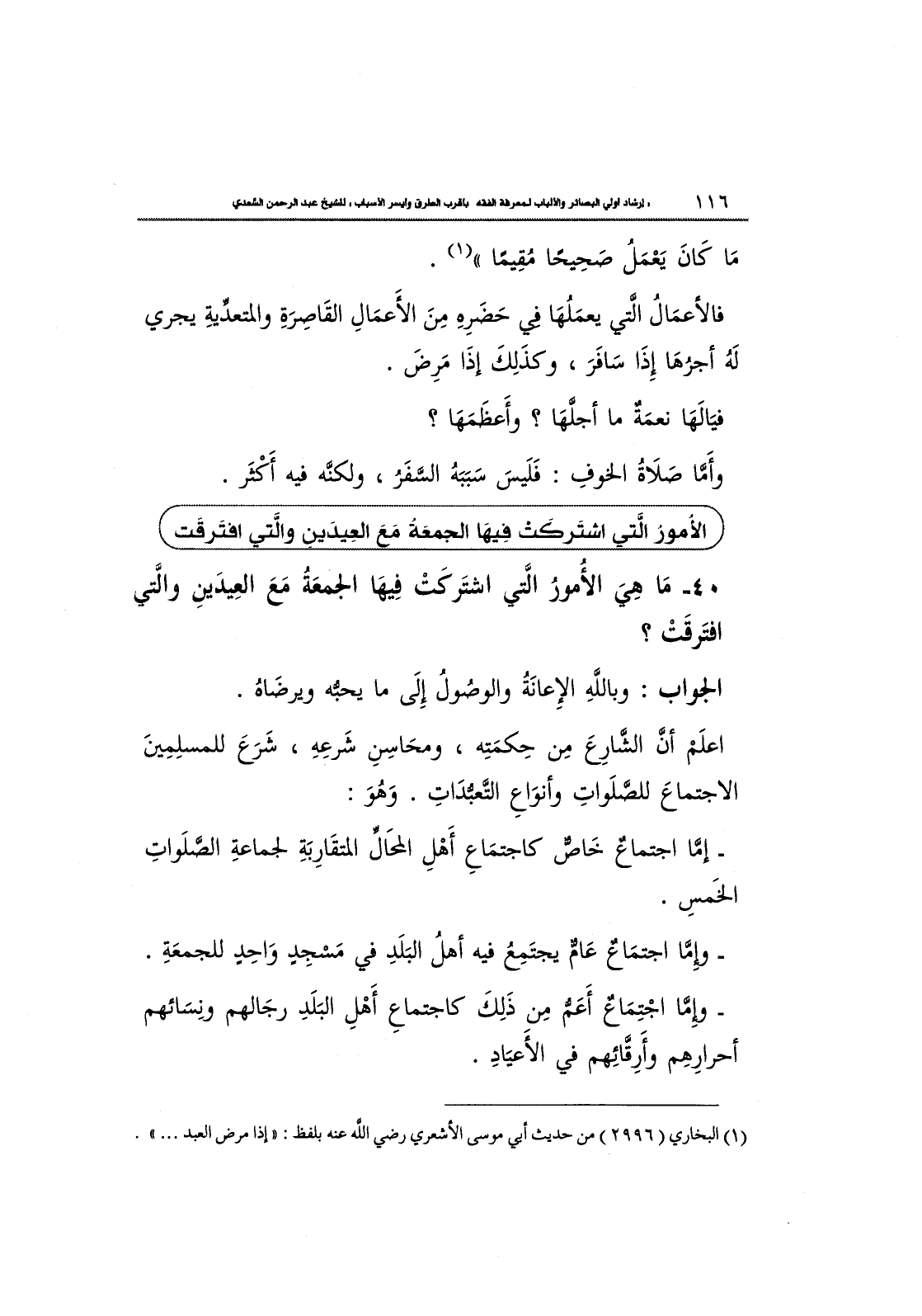 فالأعمَالُ الَّتِي يعمَلُهَا في حَضَرِهِ مِنَ الأَعمَالِ القَاصِرَةِ والمتعدِّيةِ يجري لَهُ أجرُهَا إِذَا سَافَرَ، وكذَلِكَ إذَا مَرِضَ.