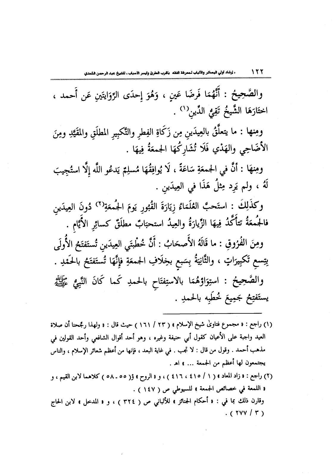 وكذَلِكَ: استَحبَّ العُلَمَاءُ زِيَارَةَ القُبُورِ يَومَ الجُمعَةِ دونَ العِيدَينِ؛ فالجُمعَةُ تتأكدُ فِيهَا الزِّيارَةُ والعِيدُ استحبَابٌ مطلَقٌ كسائِرِ اَلأَيَّام.