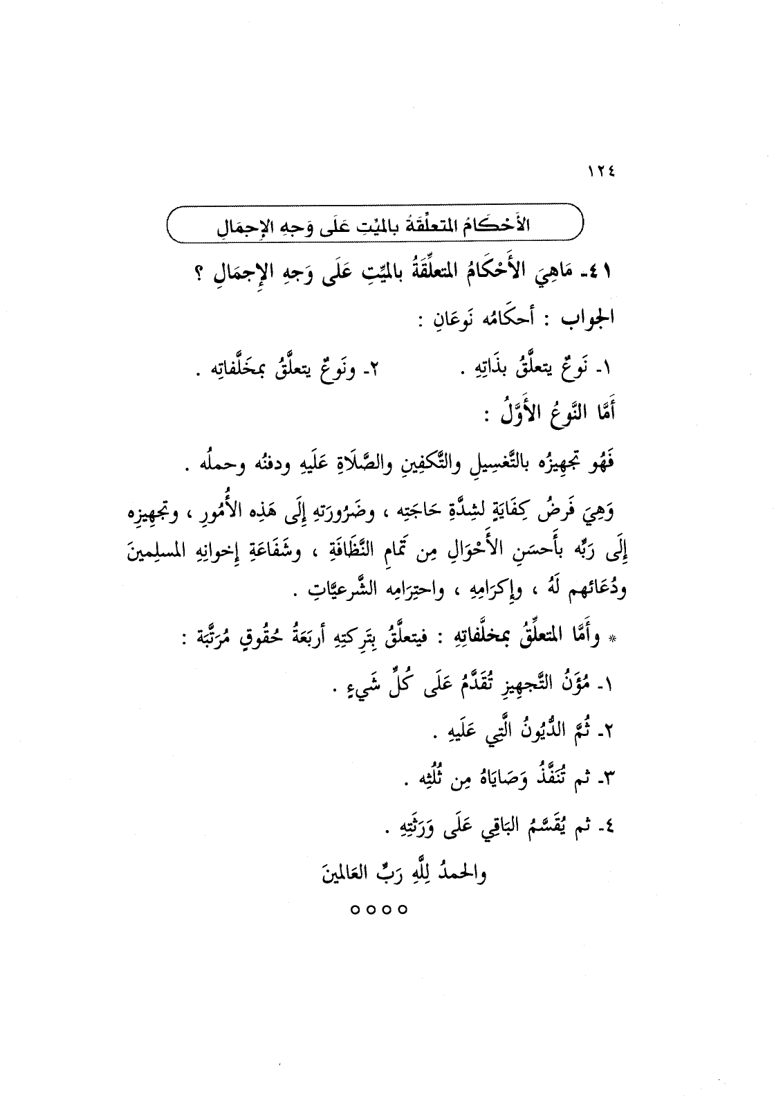 41- مَاهِيَ الأَحْكَامُ المتعلِّقَةُ بالميِّتِ على وَجهِ الإِجمَالِ؟