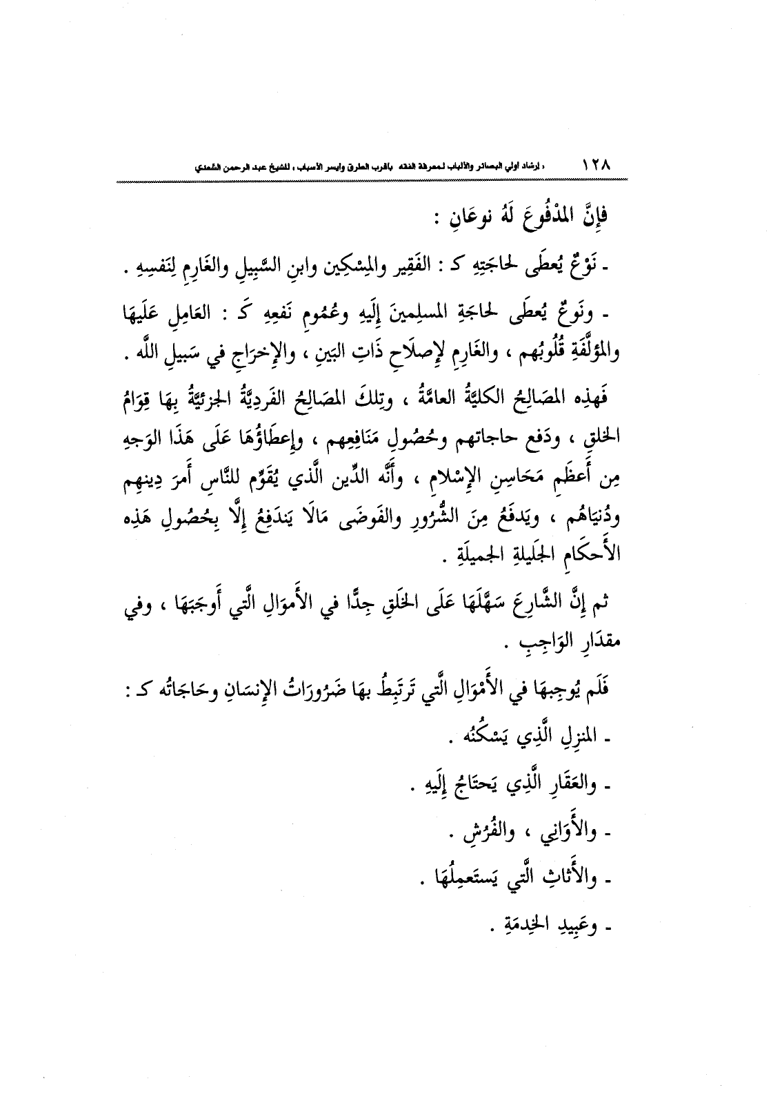 وَنَوْعٌ يُعطَى لحاجَةِ المسلِمين إِلَيْهِ وعُمُومِ نَفعِهِ كَـ: العَامِلِ عَلَيهَا والمؤلَّفَةِ قُلُوبُهم، والغَارِمِ لإِصلاحِ ذَاتِ البَينِ، والإِخرَاجِ في سَبيلِ اللَّه.