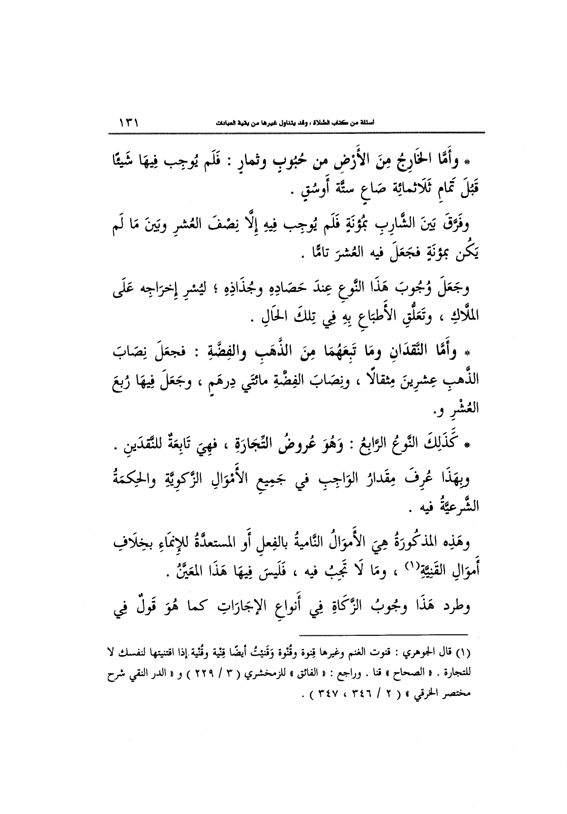 وهَذِه المذكُورَةُ هِيَ الأَموَالُ النَّاميةُ بالفِعلِ أَو المستعدَّةُ للإِنمَاءِ بخِلافِ أَموَالِ القَنِيًّةِ، ومَا لا تَجِبُ فيه، فَلَيسَ فِيهَا هَذَا المعَينُ.
