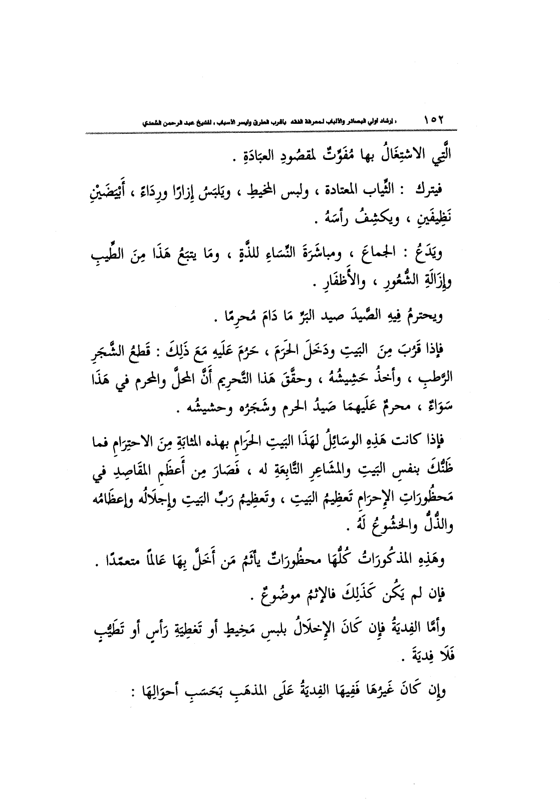 فإذا كانت هَذِهِ الوسَائِلُ لهَذَا البَيتِ الحَرَامِ بهذه المثابَةِ مِنَ الاحتِرَامِ فما ظَنكَ بنفسِ البَيتِ والمشَاعِرِ التَّابِعَةِ له، فَصَارَ مِن أَعظَمِ المقَاصِدِ في مَحظُورَاتِ اَلإِحْرَام تَعظِيمُ البَيتِ، وتَعظِيمُ رَبِّ البَيتِ وإِجلالُه وإعظَامُه والذلُّ والخشُوعُ لَهُ.