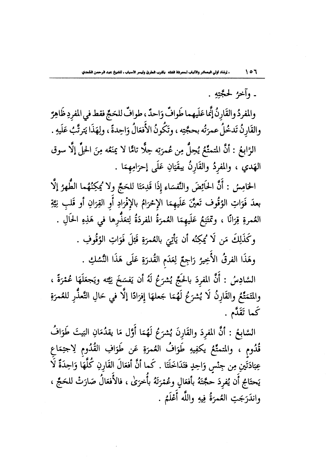 اَلسَّادِس: أَنَّ المفرِدَ بِالْحَجِّ يُشرَعُ لَهُ أن يَفسَخَ نيته ويَجعَلَهَا عُمرَةً، والمتَمَتِّعُ والقَارِنُ لا يُشرَعُ لَهُمَا جَعلهَا إِفرَادًا إلاَّ في حَالِ التَّعذُّرِ للعُمرَةِ كَما تَقَدَّم.