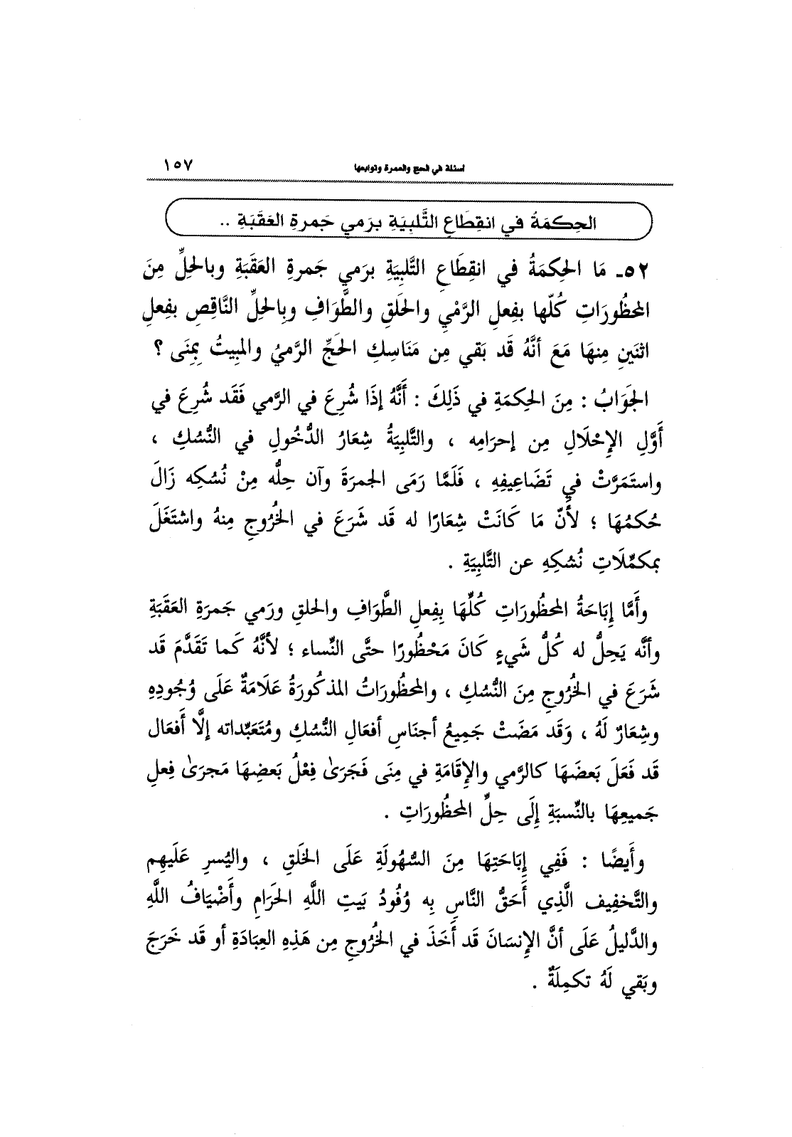 52- مَا الحِكمَةُ في انقِطَاعِ التَّلبِيَةِ برَمي جَمرةِ العَقَبَةِ وبالحِلِّ مِنَ المحظورَاتِ كُلّها بفِعلِ الرَّمْيِ والحَلقِ وَالطَّوَاف وبالحِلِّ النَّاقِصِ بفِعلِ اثنَينِ مِنهَا مَعَ أنَّهُ قَد بَقي مِن مَنَاسِكِ اَلْحَجّ الرَّمي والمبِيتُ بِمِنَى؟