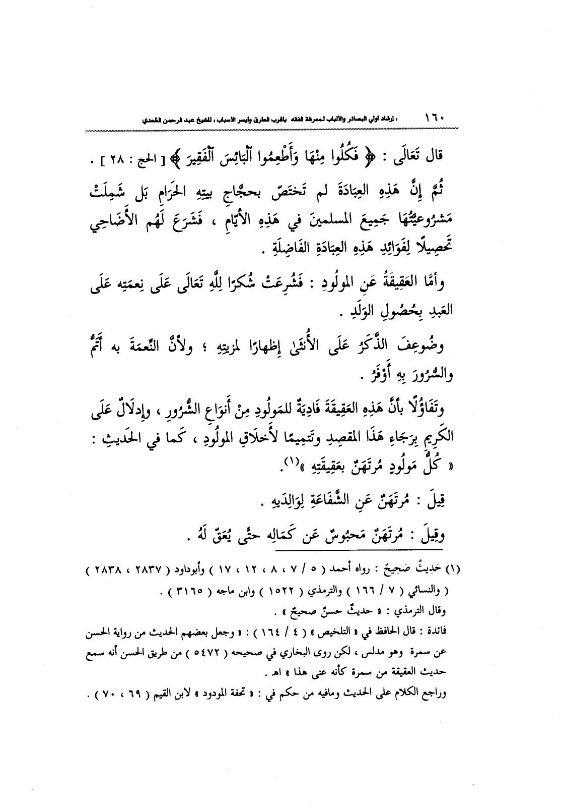 وتَفَاؤُلا بأنَّ هَذِهِ اَلْعَقِيقَة فَادِيَةٌ للمَولُودِ مِنْ أَنوَاعِ اَلشُّرُور، وإِدلال عَلَى الكَرِيم بِرَجَاء هَذَا المقصِدِ وَتَتْمِيمًا لأَخلاقِ المولُودِ، كَما في الحَديثِ: «كُلِّ مَولُودٍ مُرتَهَنٌ بعَقِيقَتِهِ» .